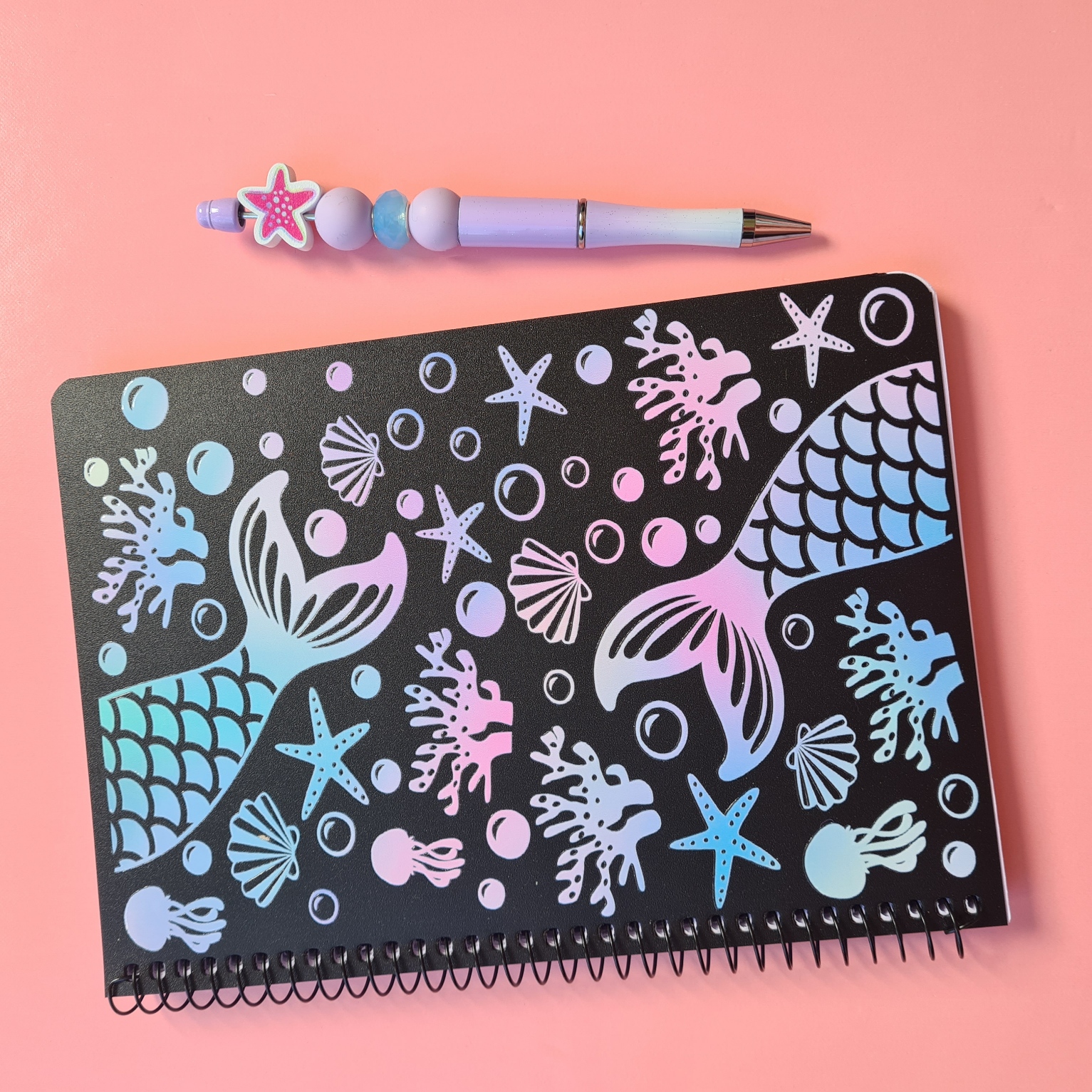 Notebook Design: Black notebook with mermaid tails, shells, starfish, jellyfish, seaweed, and bubbles