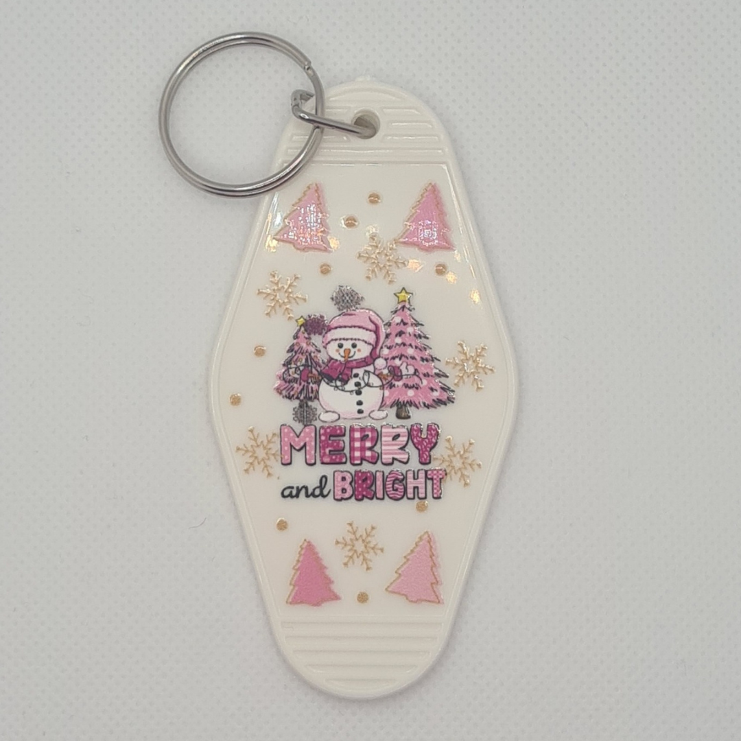 Add a cheerful touch to your everyday essentials with our Merry and Bright Keychain! This festive accessory features a crisp white keychain with a silver keyring, showcasing the joyful words “Merry and Bright” alongside a charming snowman and pink Christmas trees.