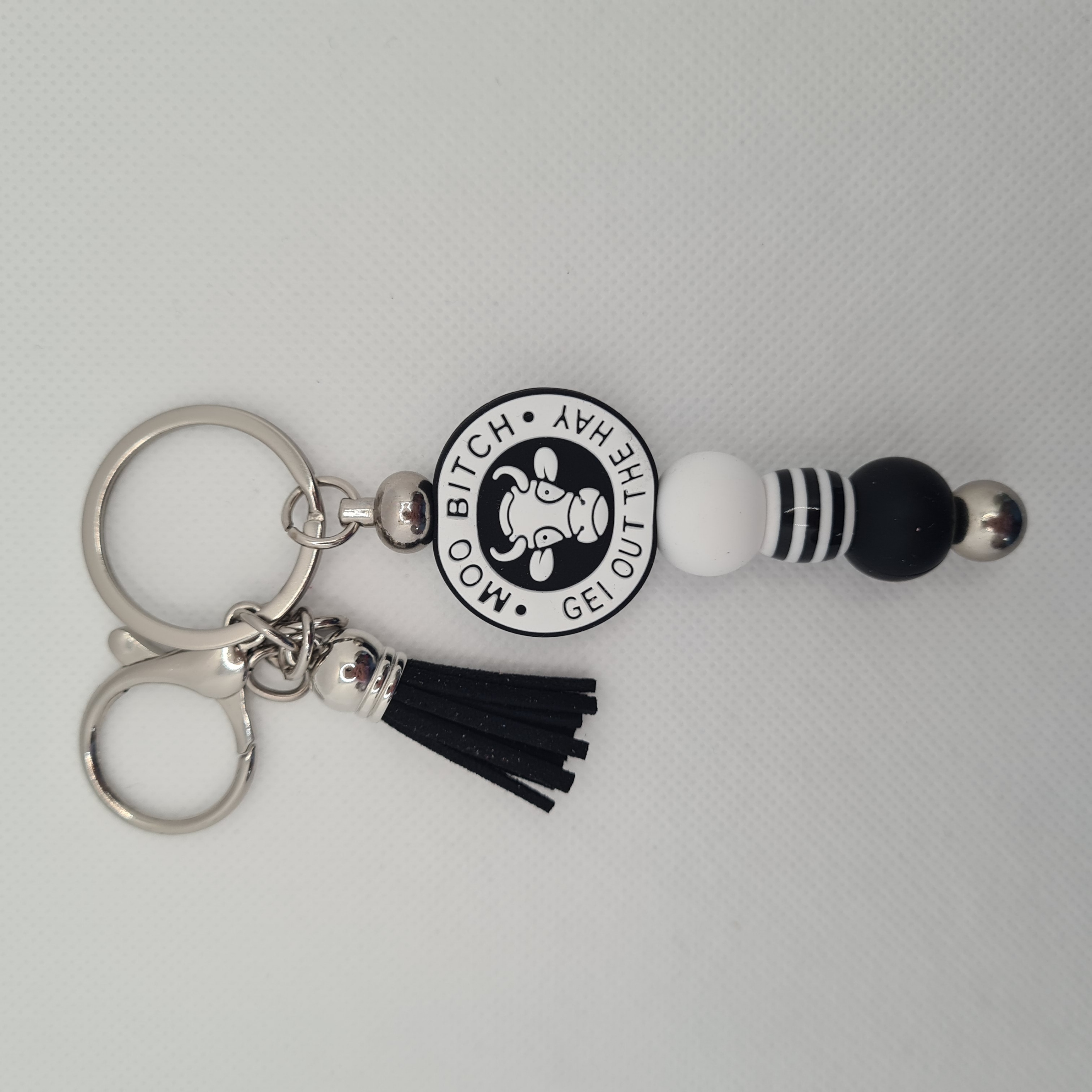 Fun, cheeky, and full of farmyard sass, our Moo Bitch Silicone Bead Keychain is sure to get a laugh. The focal bead features a cow alongside the words “Moo Bitch Get Out the Hay” — a playful twist on a classic phrase. It’s paired with black and white silicone beads for a bold monochrome look that matches the cow theme perfectly.