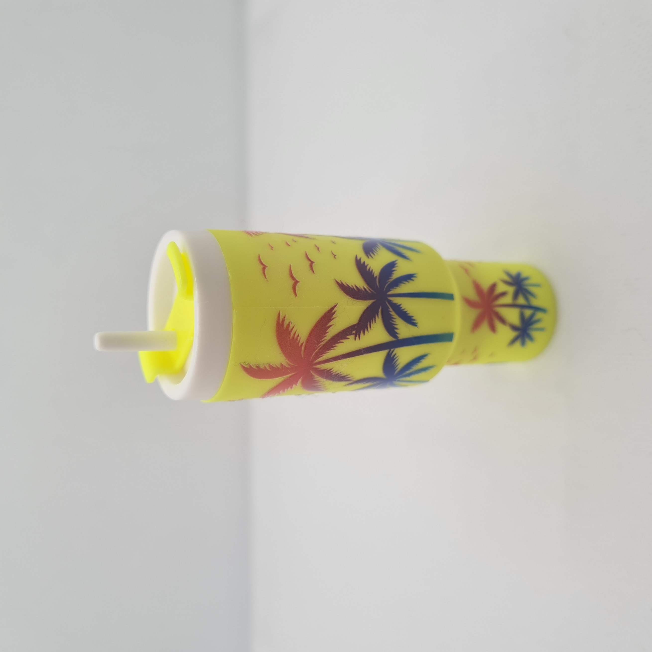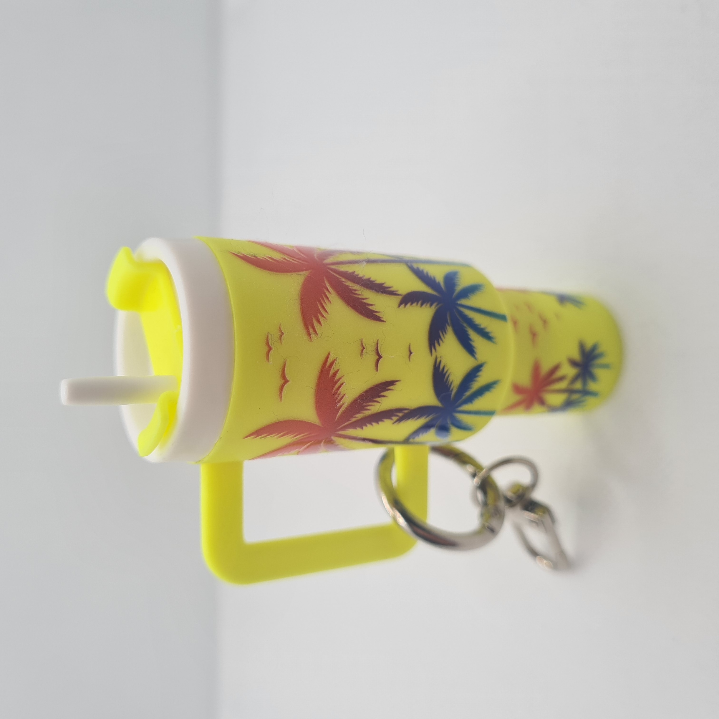 Bring a splash of tropical fun wherever you go with the Palm Tree Mini Tumbler Keychain. This bright yellow tumbler-shaped keychain is covered in colourful palm trees, giving it a cheerful, summery vibe.