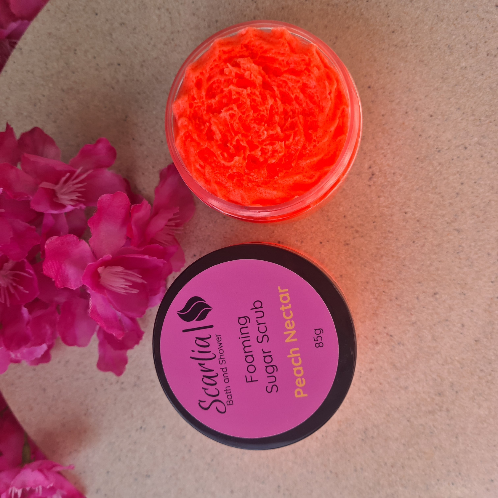 Brighten your self-care routine with the juicy sweetness of our Peach Nectar Foaming Sugar Scrub. This 2-in-1 treat gently buffs away dead skin cells while creating a rich, creamy lather that leaves your skin feeling soft, smooth, and refreshed. Infused with Shea Butter and Vitamin E, it not only polishes but also nourishes, locking in moisture for lasting hydration.