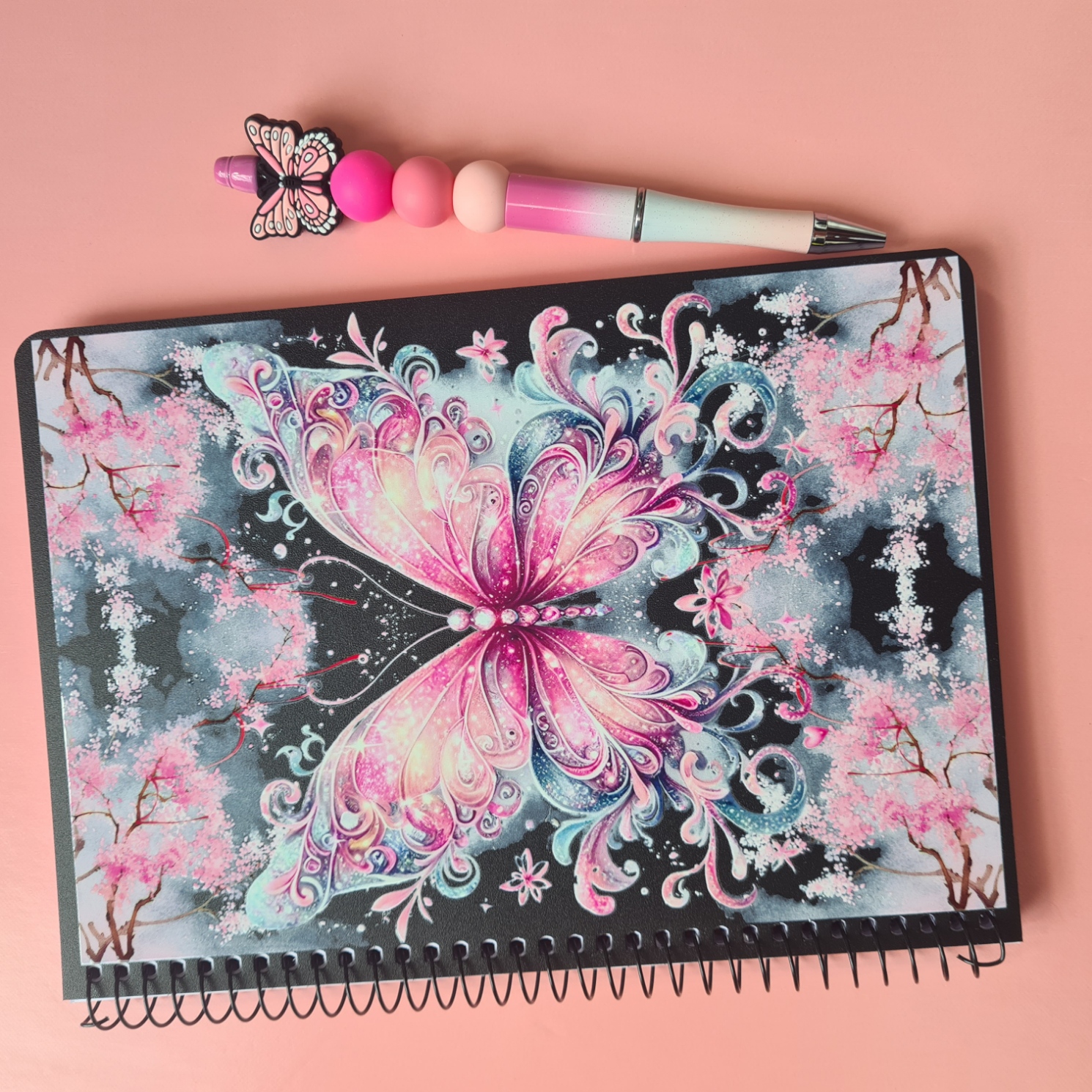 Notebook Design: Black notebook with a large pink butterfly, branches, and pink flowers and leaves