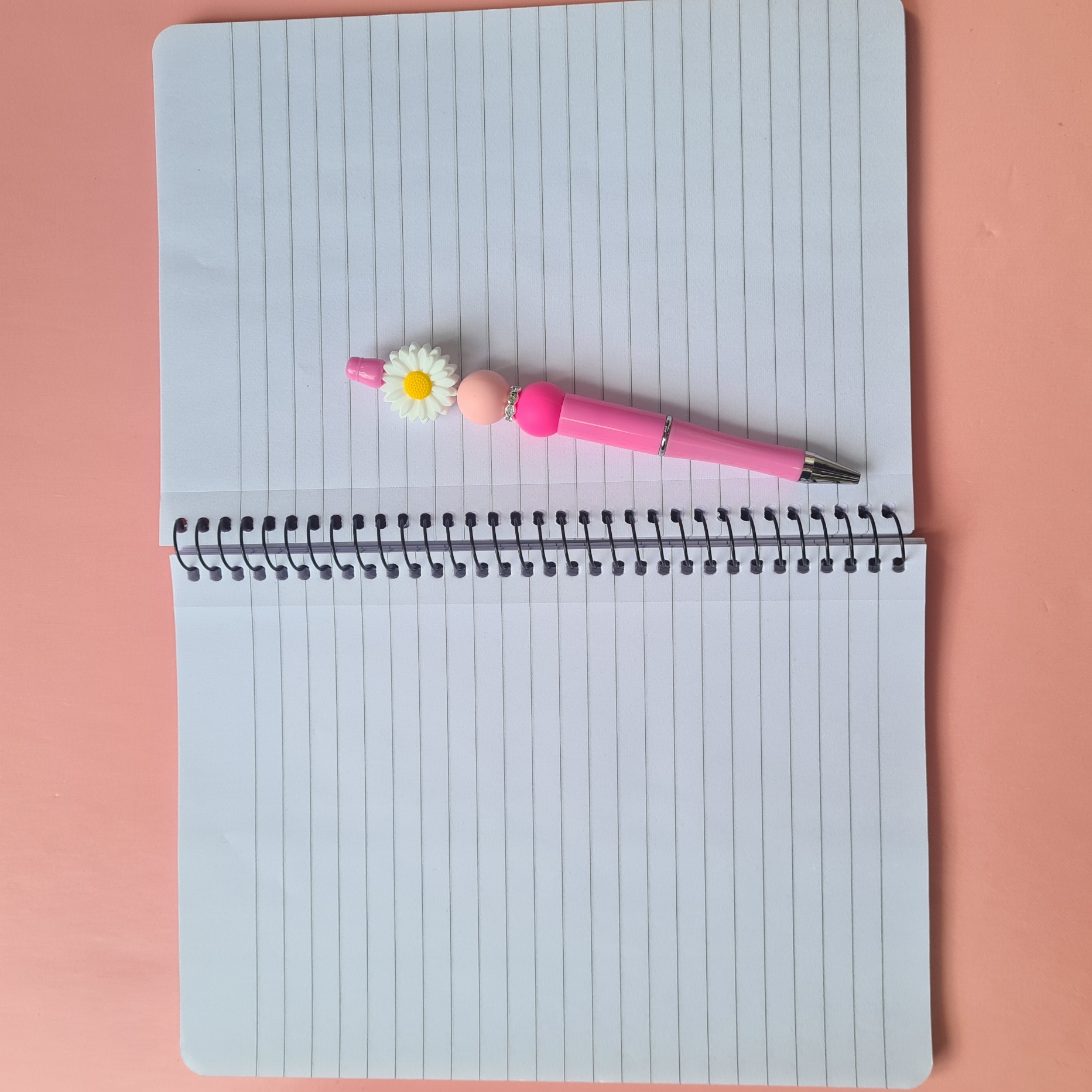 The bundle comes with a matching pink pen, finished with a white daisy bead and pink accent beads. It’s the perfect companion to the notebook, adding a sweet and sunny vibe to your writing.