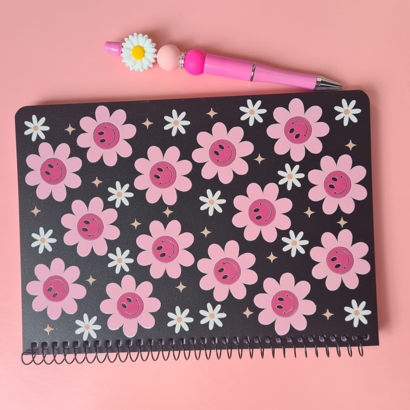 Notebook Design: Black notebook with pink smiley daisies and smaller white daisies