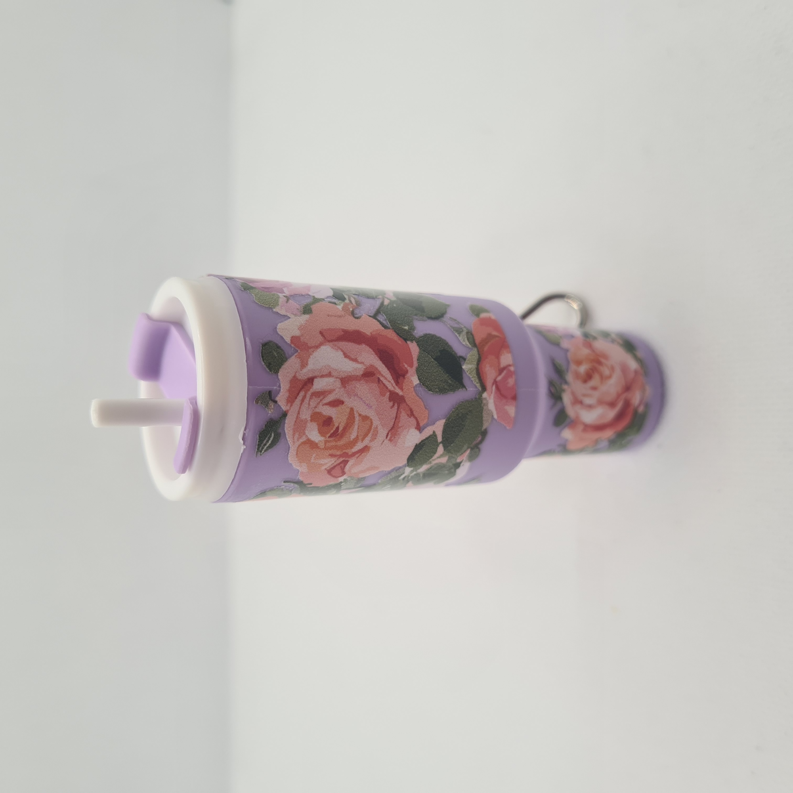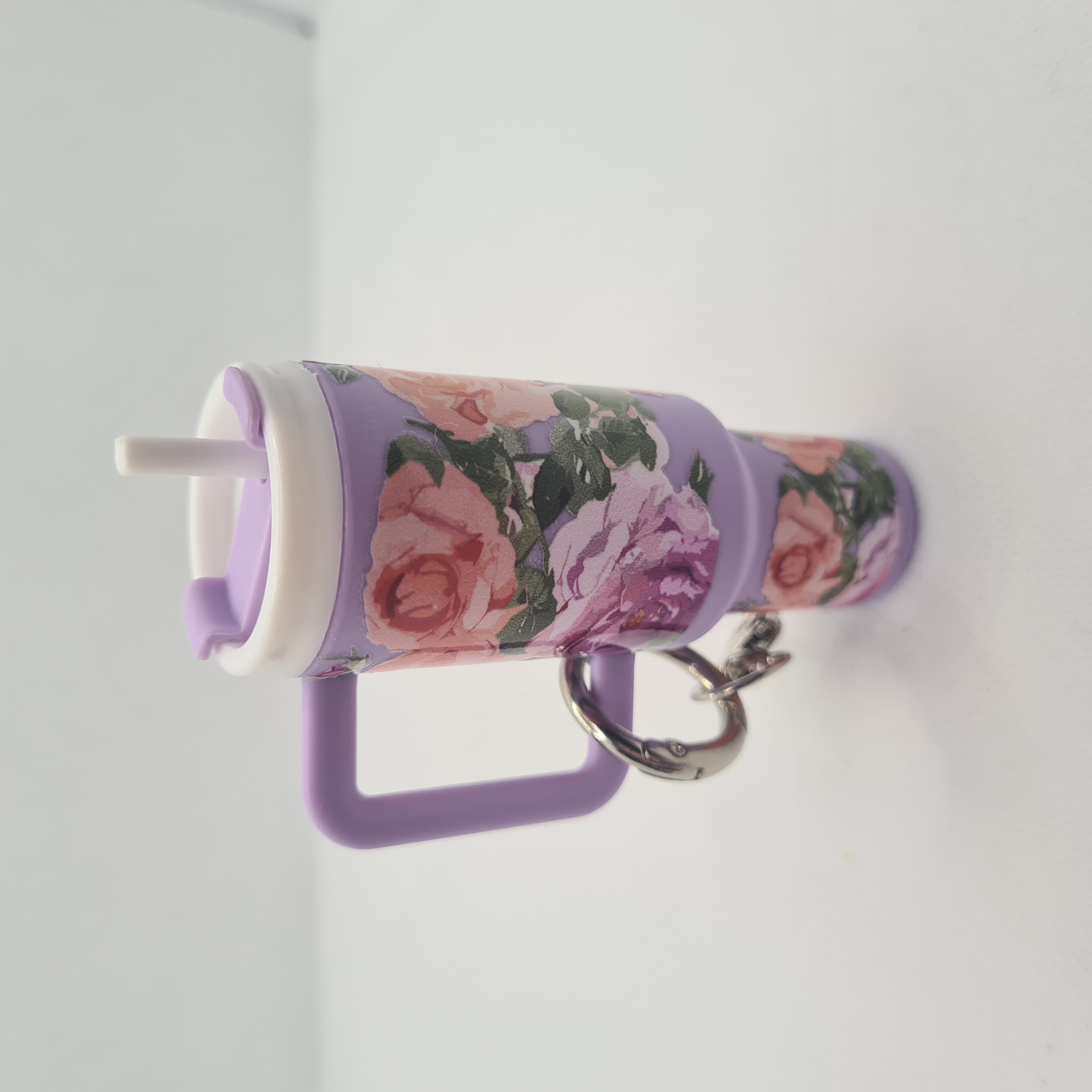 Add a touch of floral elegance to your keys or bag with our Pink Roses Mini Tumbler Keychain! This light purple tumbler-shaped keychain is beautifully adorned with pink roses, giving it a soft, feminine, and charming look.