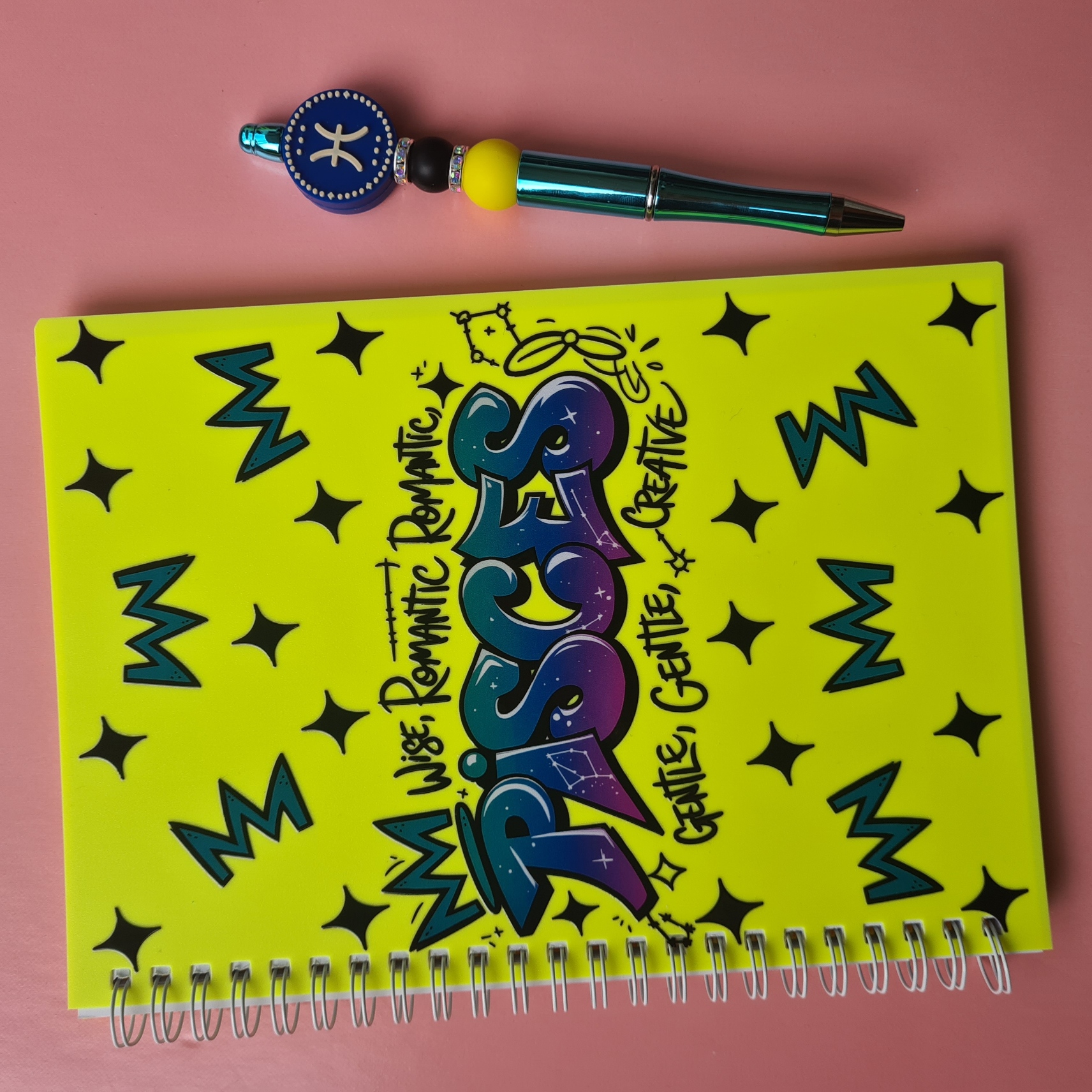 Paired with a metallic blue pen with a Pisces symbol bead.