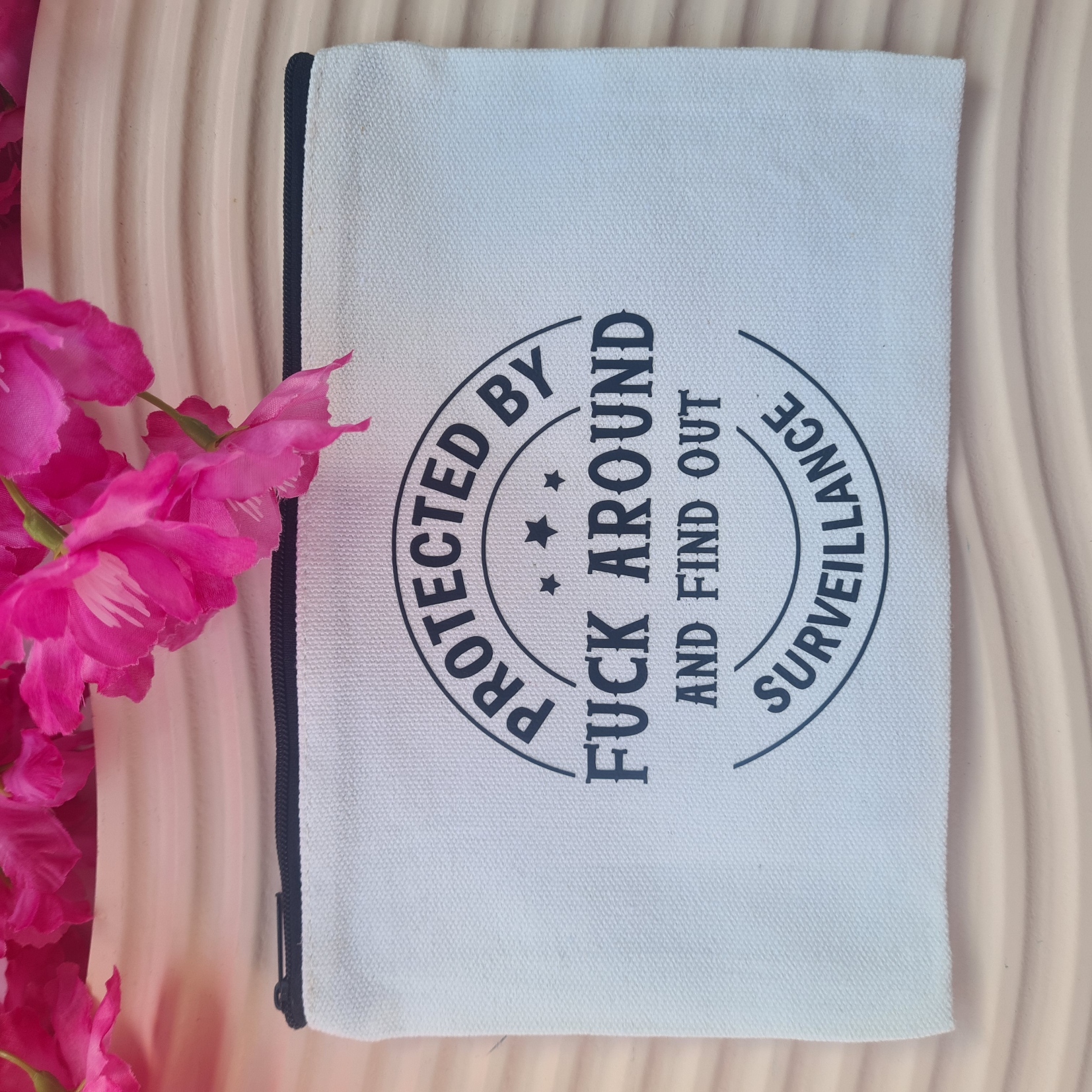 Keep your stationery safe in style with the Protected By Surveillance Pencil Case. Made from sturdy white canvas, this case features the cheeky phrase “Protected by fuck around and find out surveillance” in bold lettering. With its practical size and secure black zip closure, it’s perfect for holding pens, pencils, or even small essentials you want to keep close.