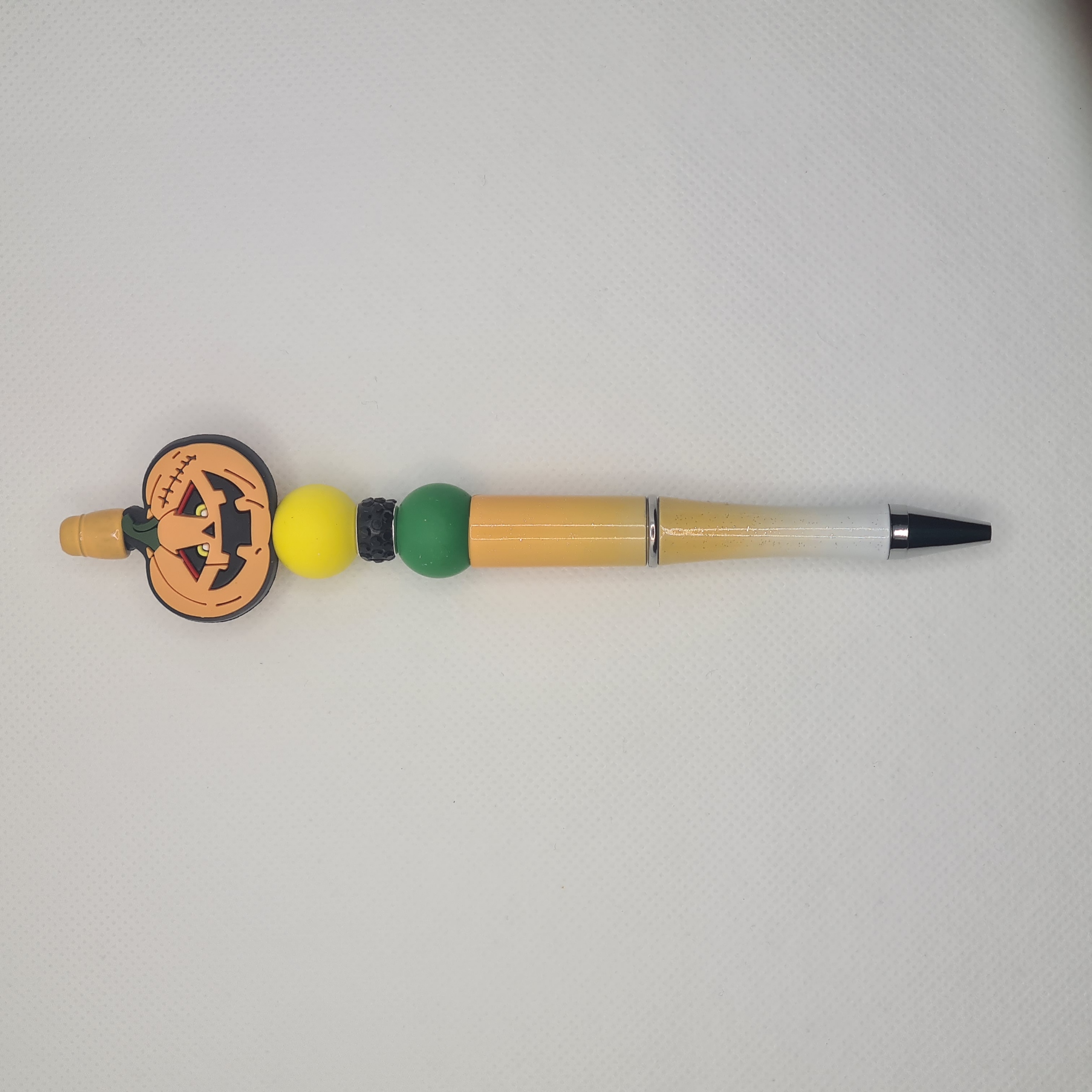 Bring a touch of Halloween spirit to your writing with the Pumpkin Silicone Bead Pen. This orange and white ombre pen features a cheerful pumpkin jack-o’-lantern focal bead, paired with yellow and green silicone beads for a festive autumn vibe. With smooth black ink, it’s perfect for jotting down notes, journaling, or adding spooky charm to your desk.