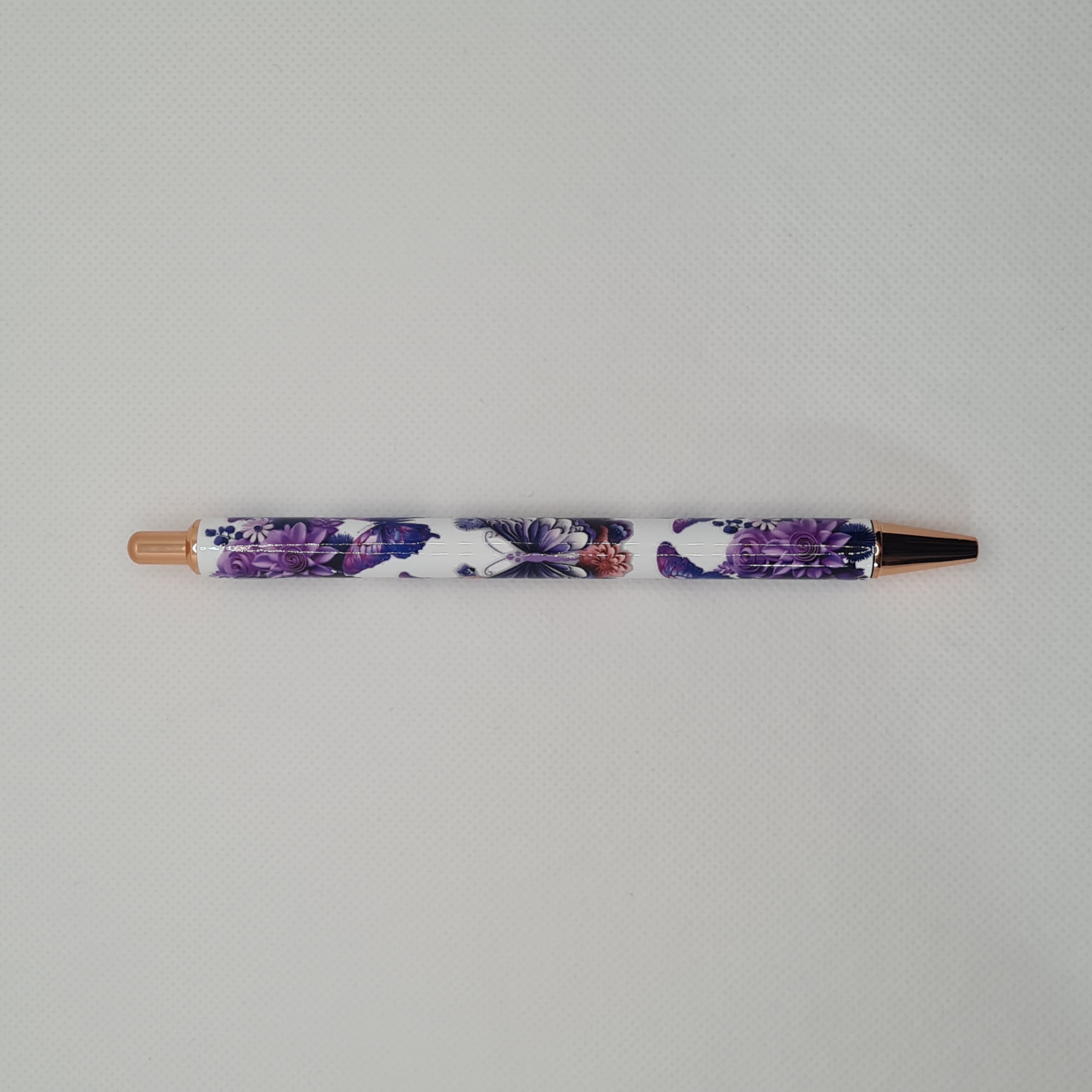 Design: White pen featuring purple butterflies surrounded by purple flowers