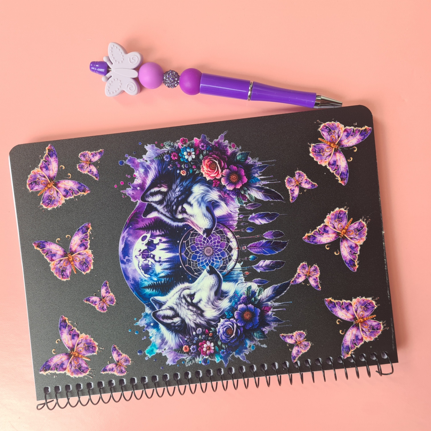 Notebook Design: Black A5 notebook with two wolves, a dreamcatcher, purple flowers, and purple butterflies