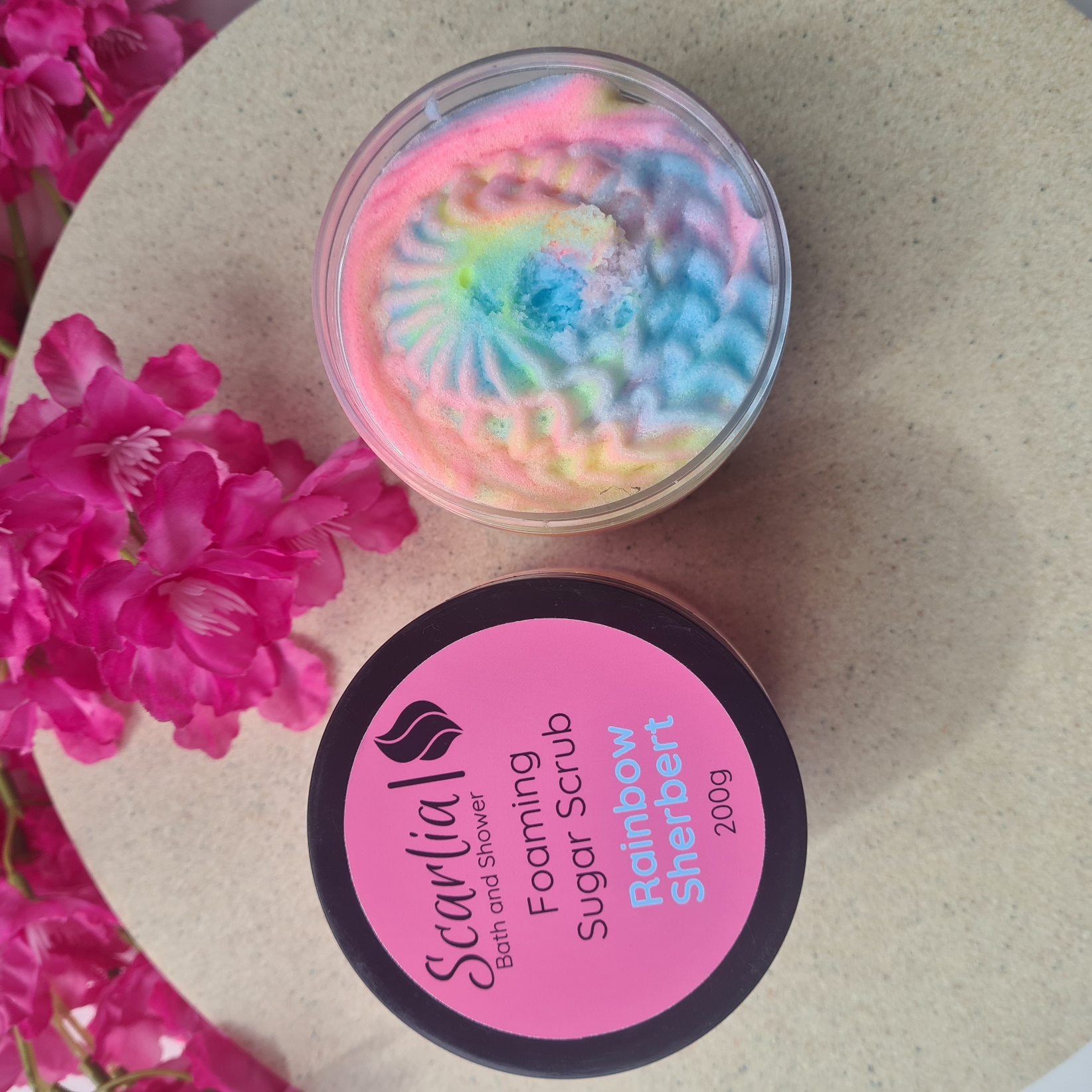 Experience a sugary fruit explosion with our Rainbow Sherbet Foaming Sugar Scrub! Bursting with the sweet, fizzy scent of tangy sherbet, this scrub combines sparkling citrus and juicy fruity top notes with a creamy base of vanilla and caramel for a playful and irresistible aroma.