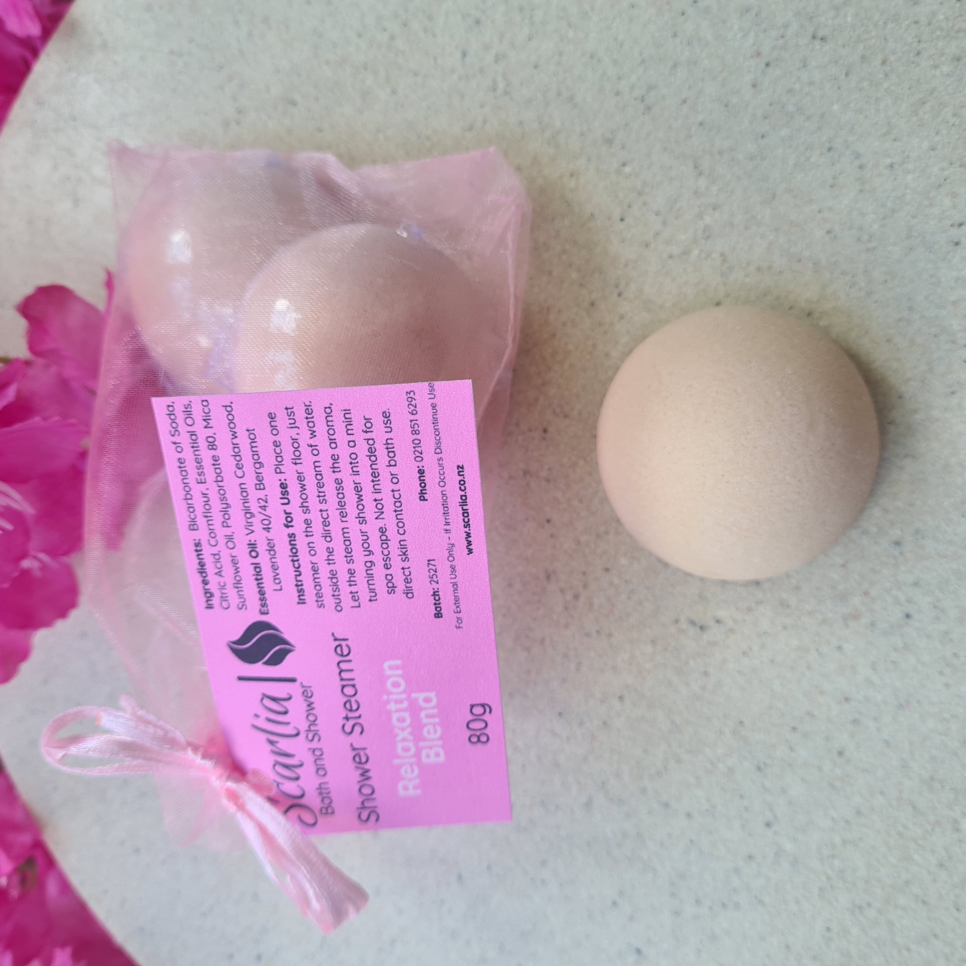 Remove one shower steamer from its wrapping and place it back into the organza bag provided. Once your shower is hot and steamy, activate the steamer by sprinkling it with a little water. Hang the bag from your shower head, tap, or a nearby hook – just make sure it’s not directly under the water flow. A light mist is all that’s needed to keep it gently fizzing and releasing its aroma. Allow the steamer to dry between uses.