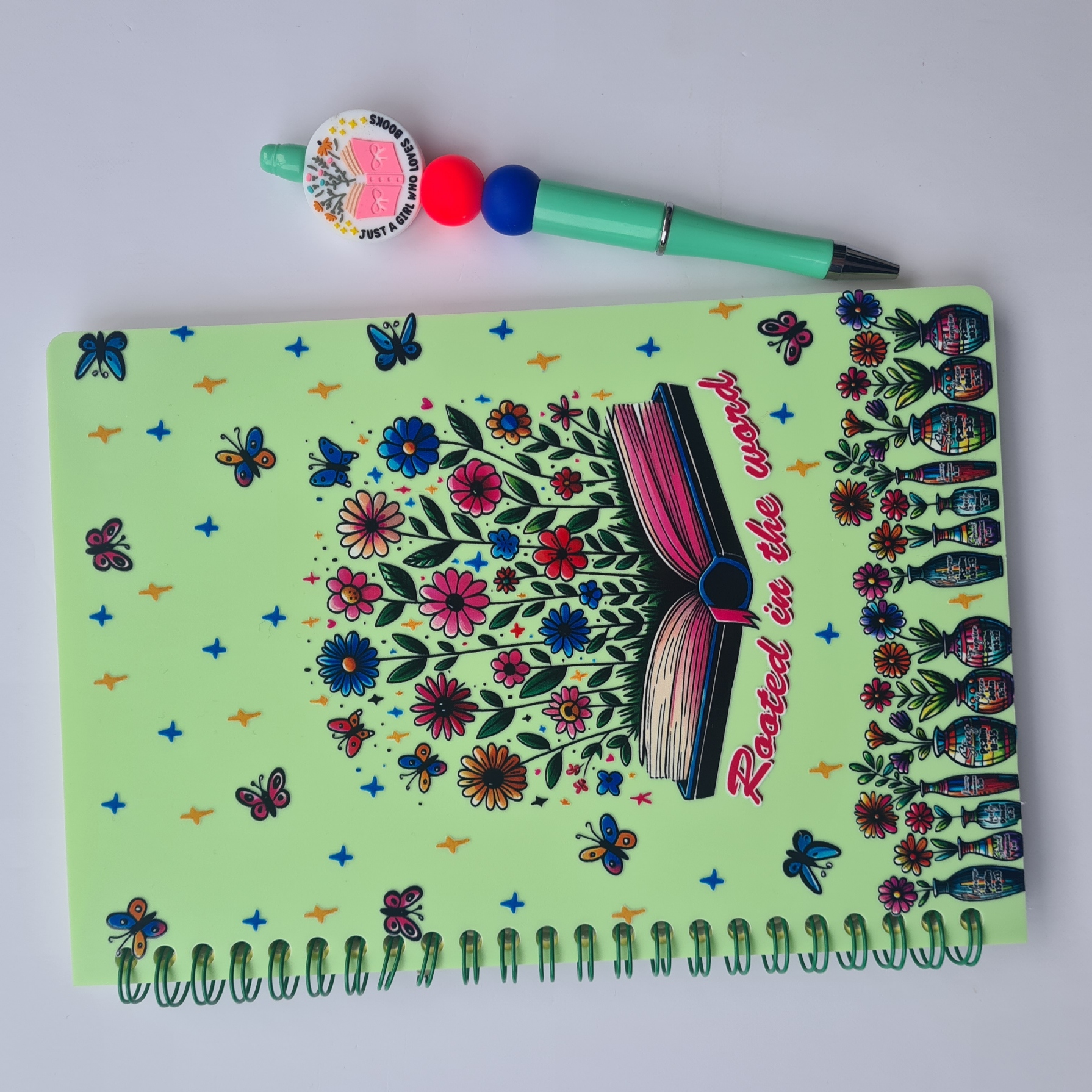 Notebook Design: Green notebook with floral book design, potted flowers, butterflies, and the words “rooted in the word”