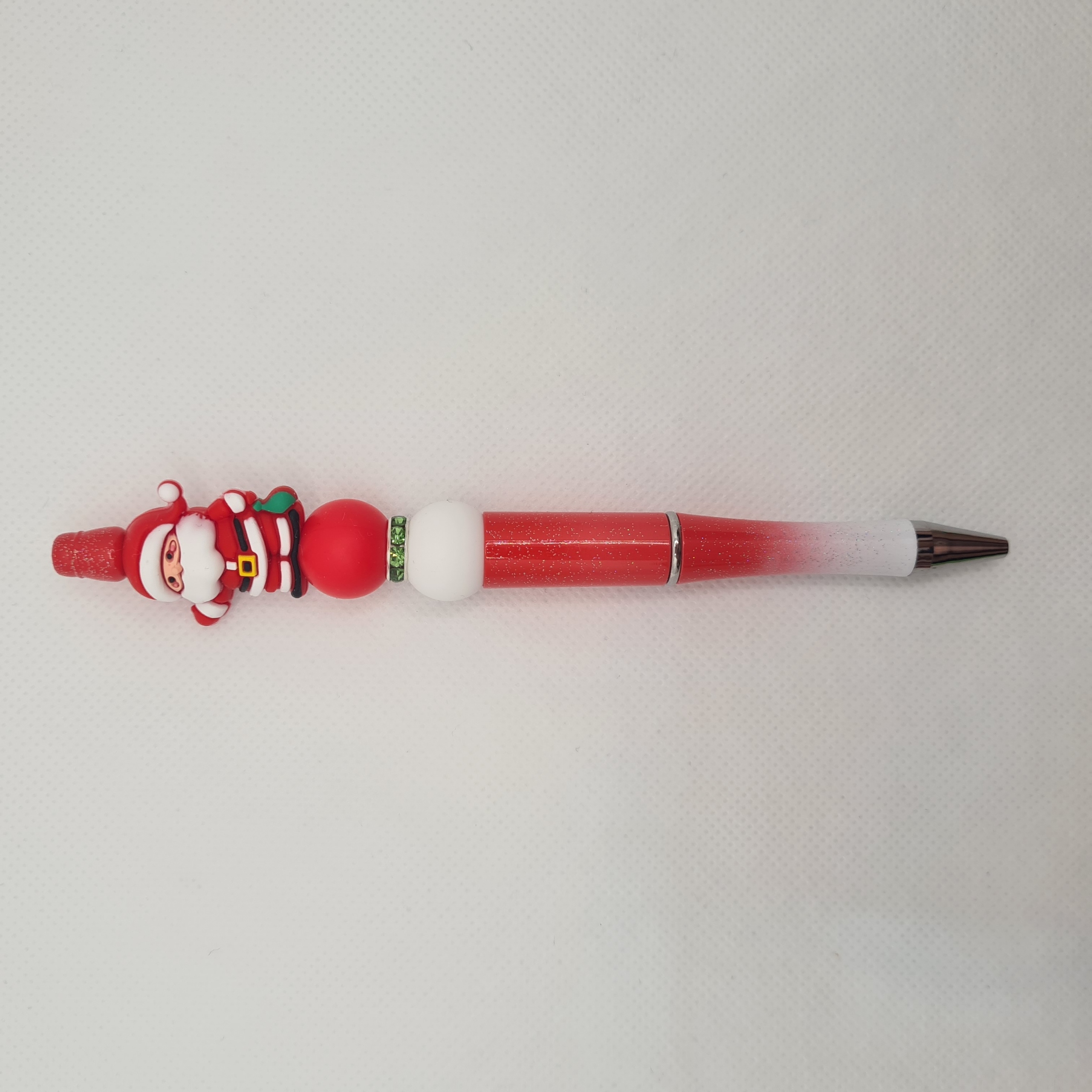 Add a jolly touch to your writing with the Santa Silicone Bead Pen. Featuring a red and white ombre pen barrel, this pen showcases a cheerful Santa-shaped focal bead that captures the magic of the holiday season. Complemented by white and red silicone accent beads, it writes smoothly in black ink while bringing classic Christmas cheer to your stationery collection.