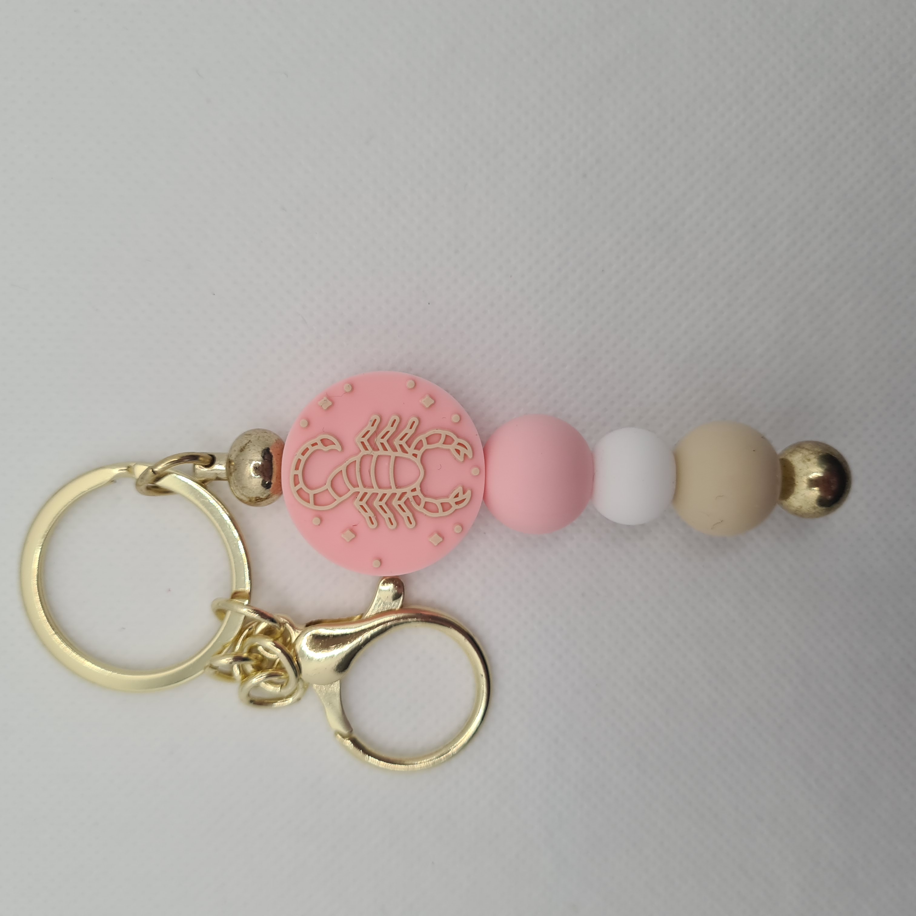 Bold and mysterious, our Scorpio Star Sign Silicone Bead Keychain is the perfect accessory for those born under this powerful sign. The pink focal bead features a detailed scorpion design — the symbol of Scorpio — representing intensity, passion, and determination. Paired with pink, tan, and white silicone beads, the colours create a striking yet balanced look that reflects Scorpio’s depth and strength.