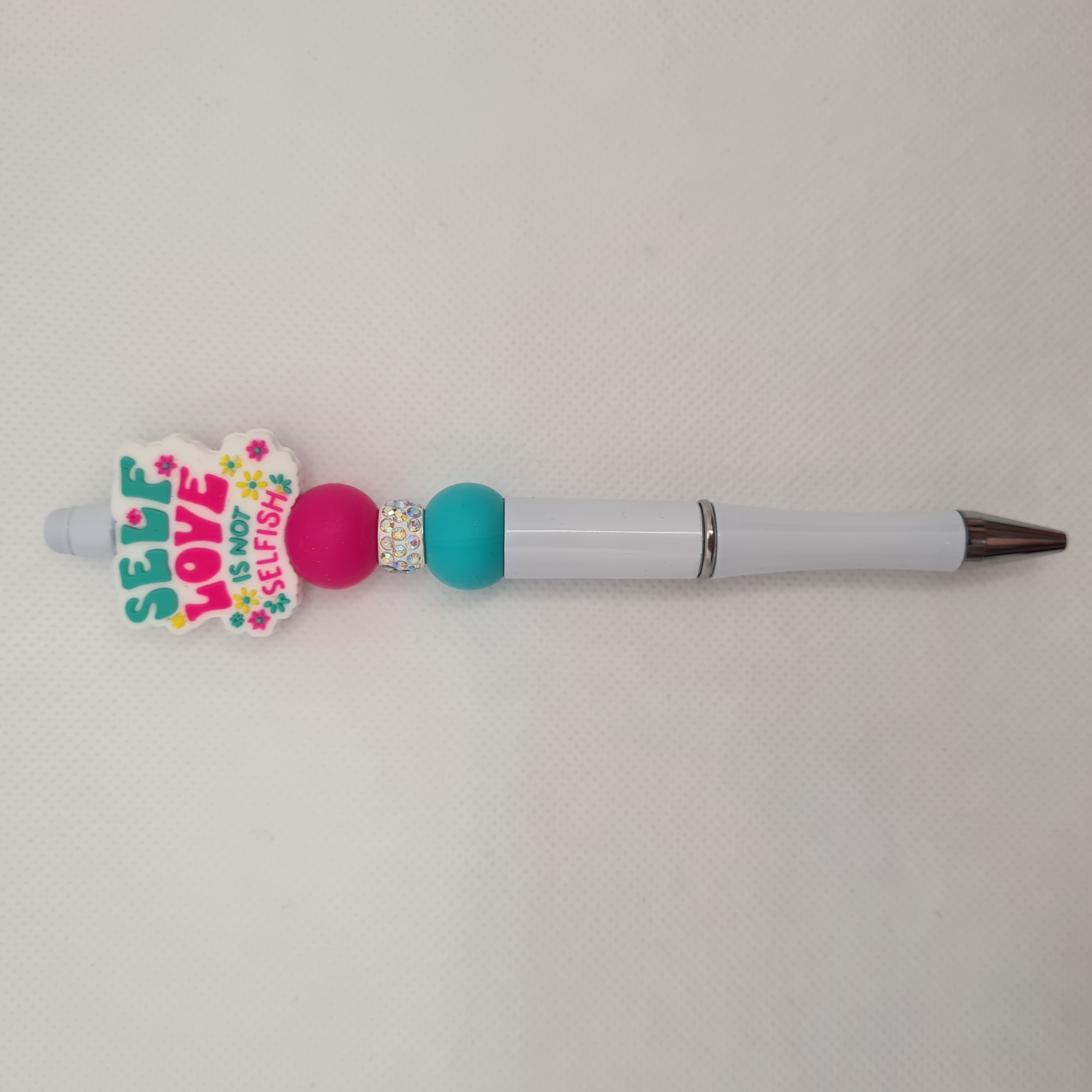 Celebrate yourself every time you write with the Self Love Is Not Selfish Silicone Bead Pen. This crisp white pen features a round focal bead with the empowering phrase “Self Love Is Not Selfish,” surrounded by delicate floral details. Pink and green silicone beads complete the cheerful and uplifting design. Smooth black ink makes it perfect for journaling, note-taking, or daily reminders to prioritise your well-being.