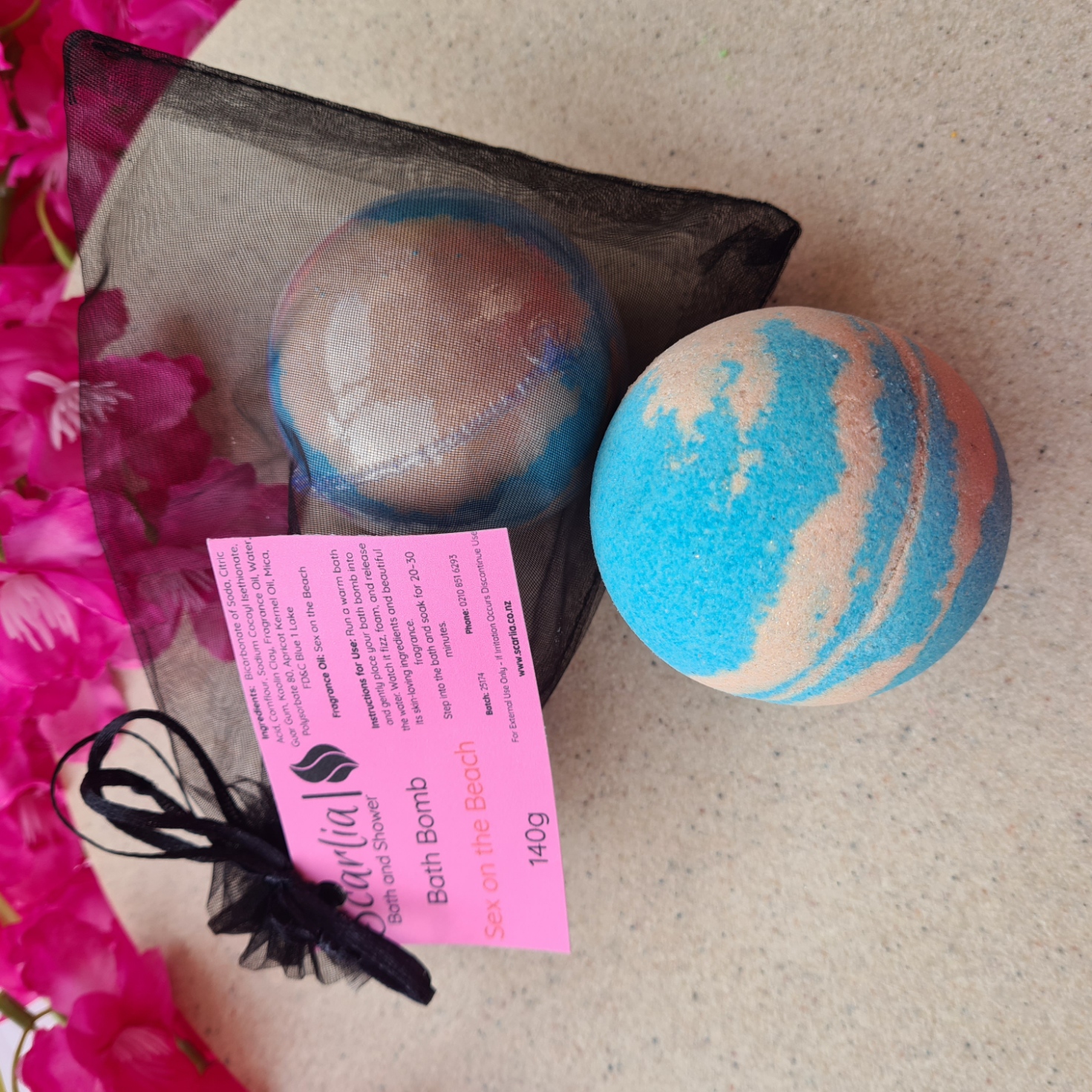 Ingredients: Bicarbonate of Soda, Citric Acid, Cornflour, Sodium Cocoyl Isethionate, Guar Gum, Kaolin Clay, Fragrance Oil (Sex on the Beach), Water, Polysorbate 80, Apricot Kernel Oil, Mica, FD&C Blue 1 Lake.