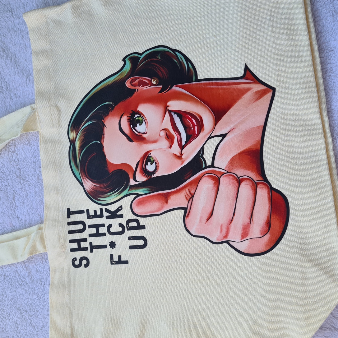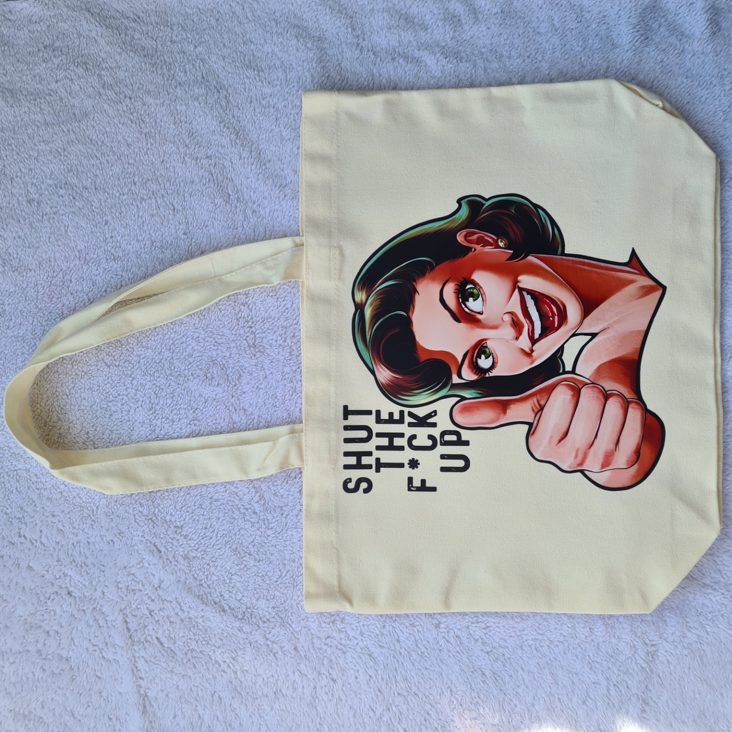 Bring humour and attitude wherever you go with the Shut The Fuck Up Tote Bag. Featuring the cheeky phrase “Shut The Fck Up”* and a woman flashing a big grin with a thumbs up, this tote is both fun and unapologetically bold.