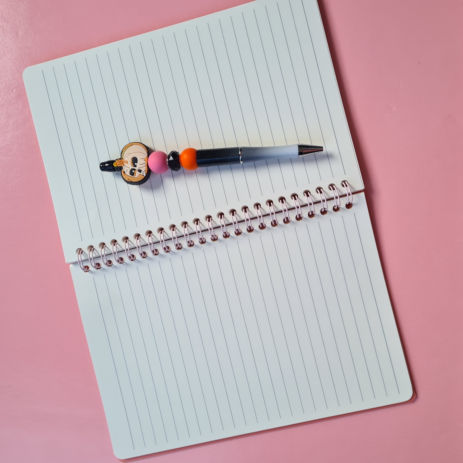 The bundle comes complete with a black and white ombre pen, finished with a unique skull/pumpkin bead and accented by pink and orange beads — the perfect pop of colour to match the notebook’s playful vibe.