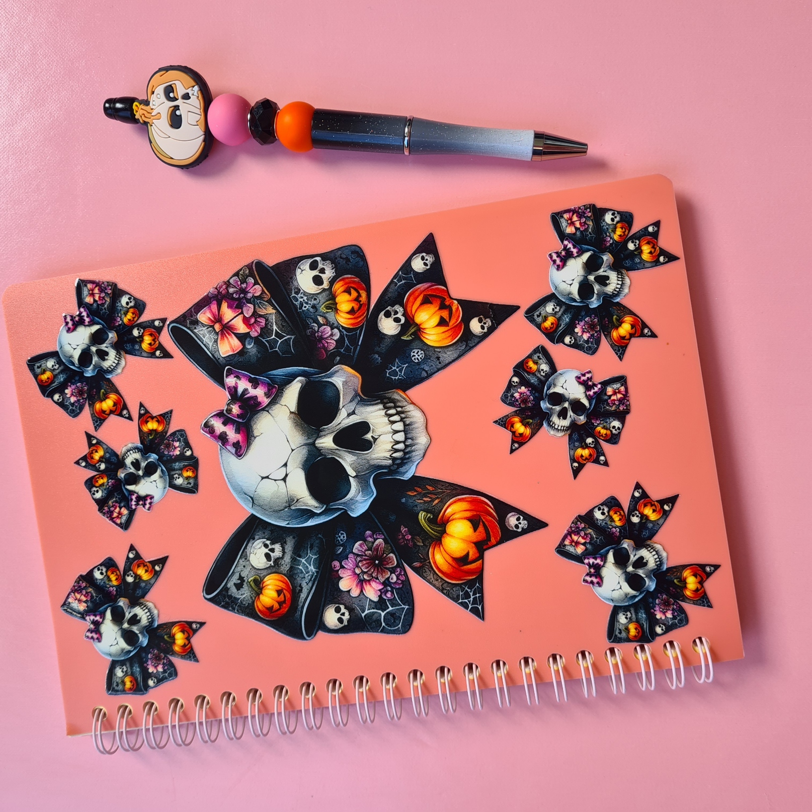 Notebook Design: Peach-coloured notebook with bows featuring skull centres, skulls wearing bows, and Halloween pumpkins