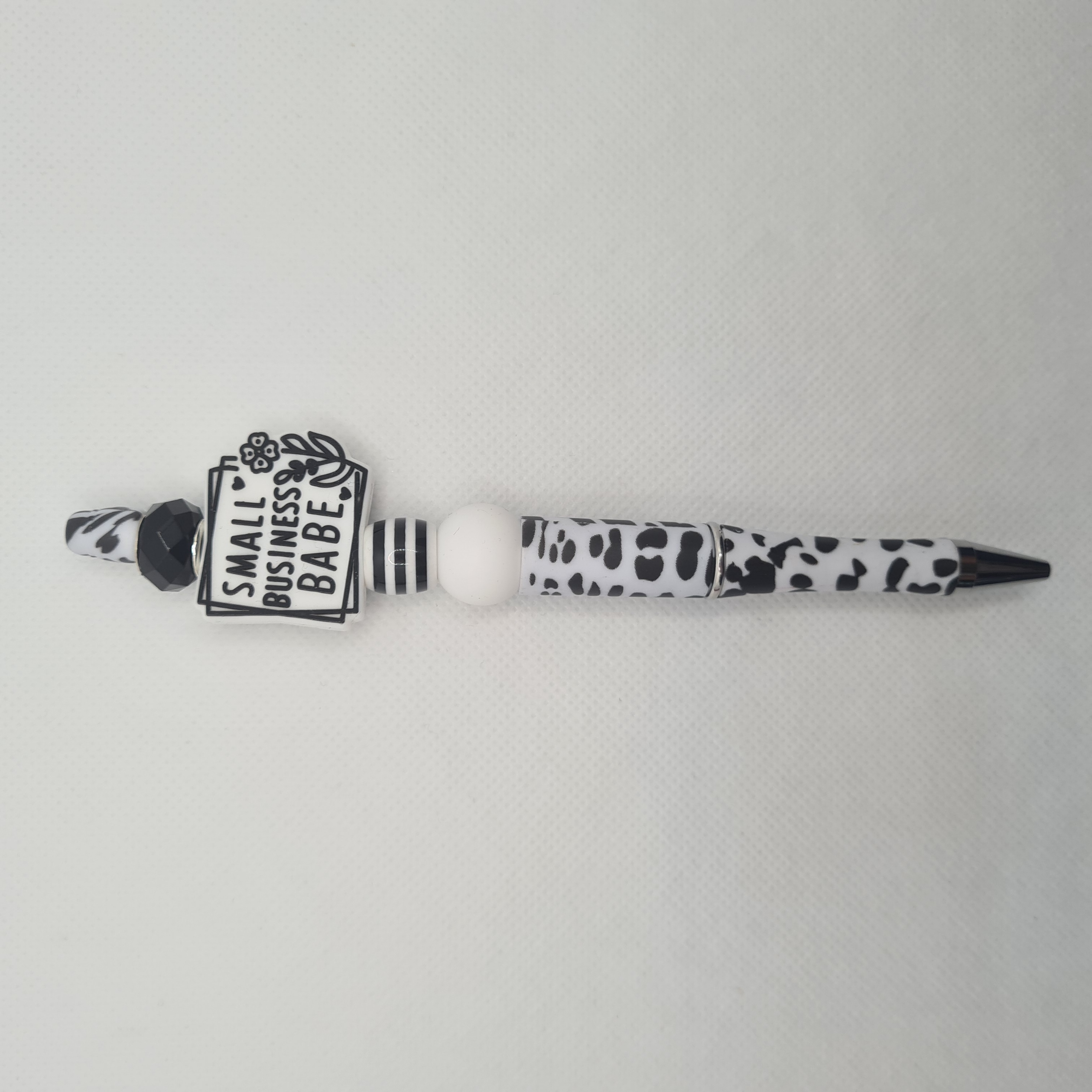 Celebrate hustle and heart with the Small Business Babe Silicone Bead Pen. Featuring a white pen barrel with black spots, this pen showcases a round focal bead with the words “small business babe” accented with a delicate flower. A coordinating white silicone accent bead completes the clean and stylish look, while smooth black ink makes it perfect for everyday writing, journaling, or planning your next big idea.