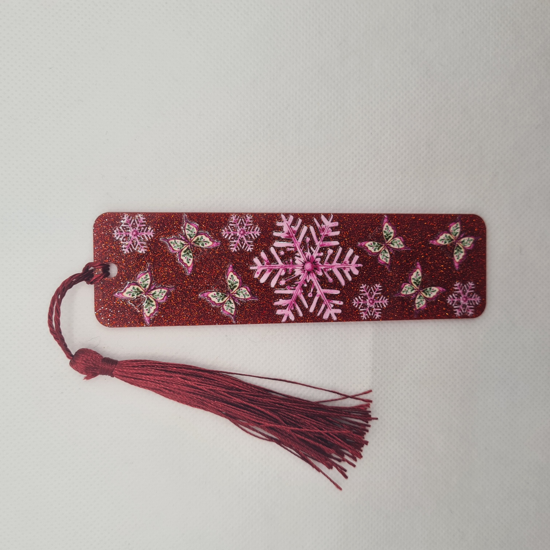 Make your winter reading extra special with our Snowflake Bookmark. Set on a dazzling red sparkly background, it features one large pink snowflake at the centre, surrounded by smaller pink snowflakes and delicate butterflies. Finished with a matching red tassel, this eye-catching design is perfect for adding a pop of colour to your books.