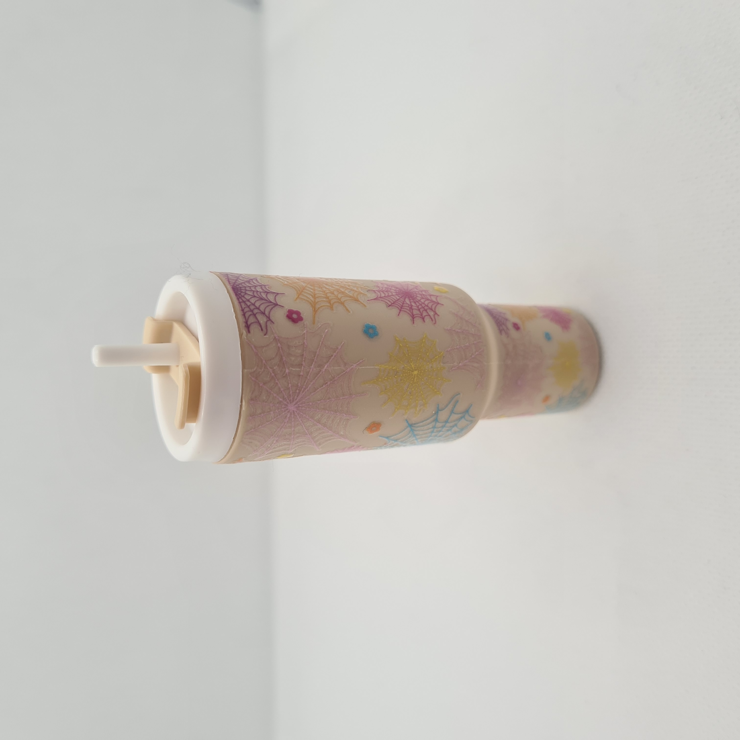 Add a fun spooky touch to your keys or bag with the Spider Web Mini Tumbler Keychain. This light tan tumbler-shaped keychain is covered in colourful spiderwebs, giving it a playful twist on a classic design.