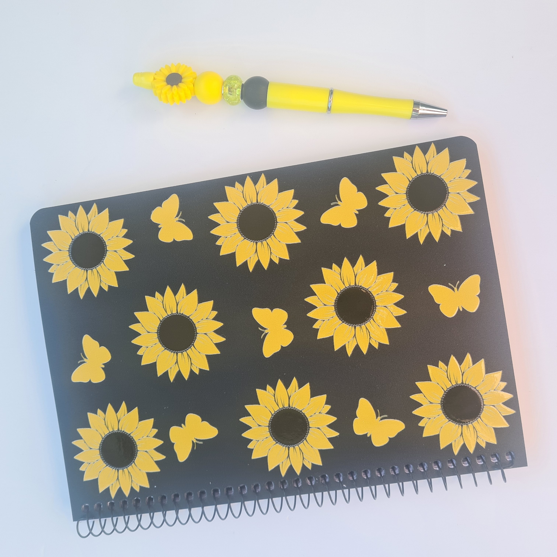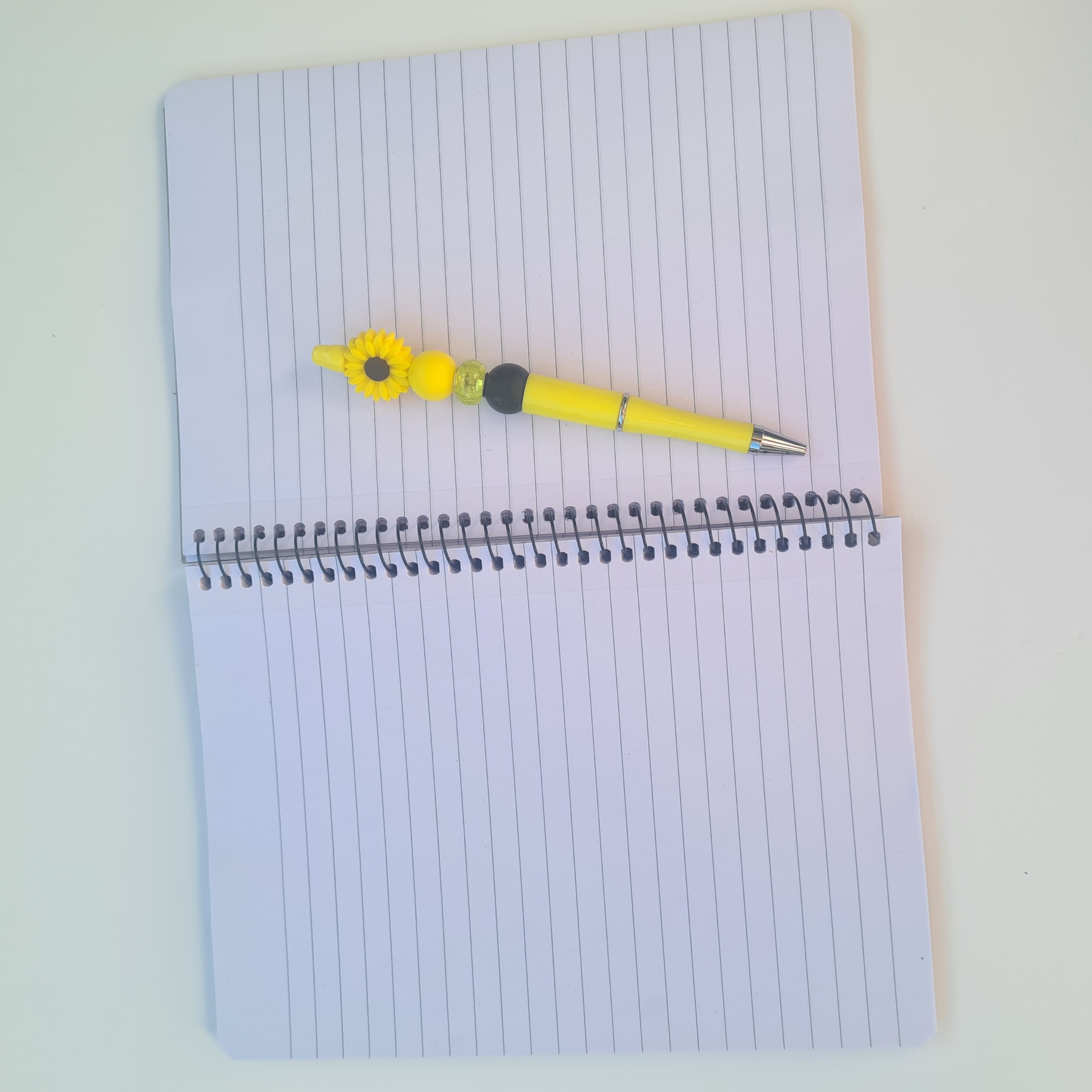 Paired with a matching yellow pen, this bundle ties the look together perfectly. The pen features a sunflower focal bead with coordinating yellow and brown accent beads, adding a warm, nature-inspired finish that complements the notebook’s design.
