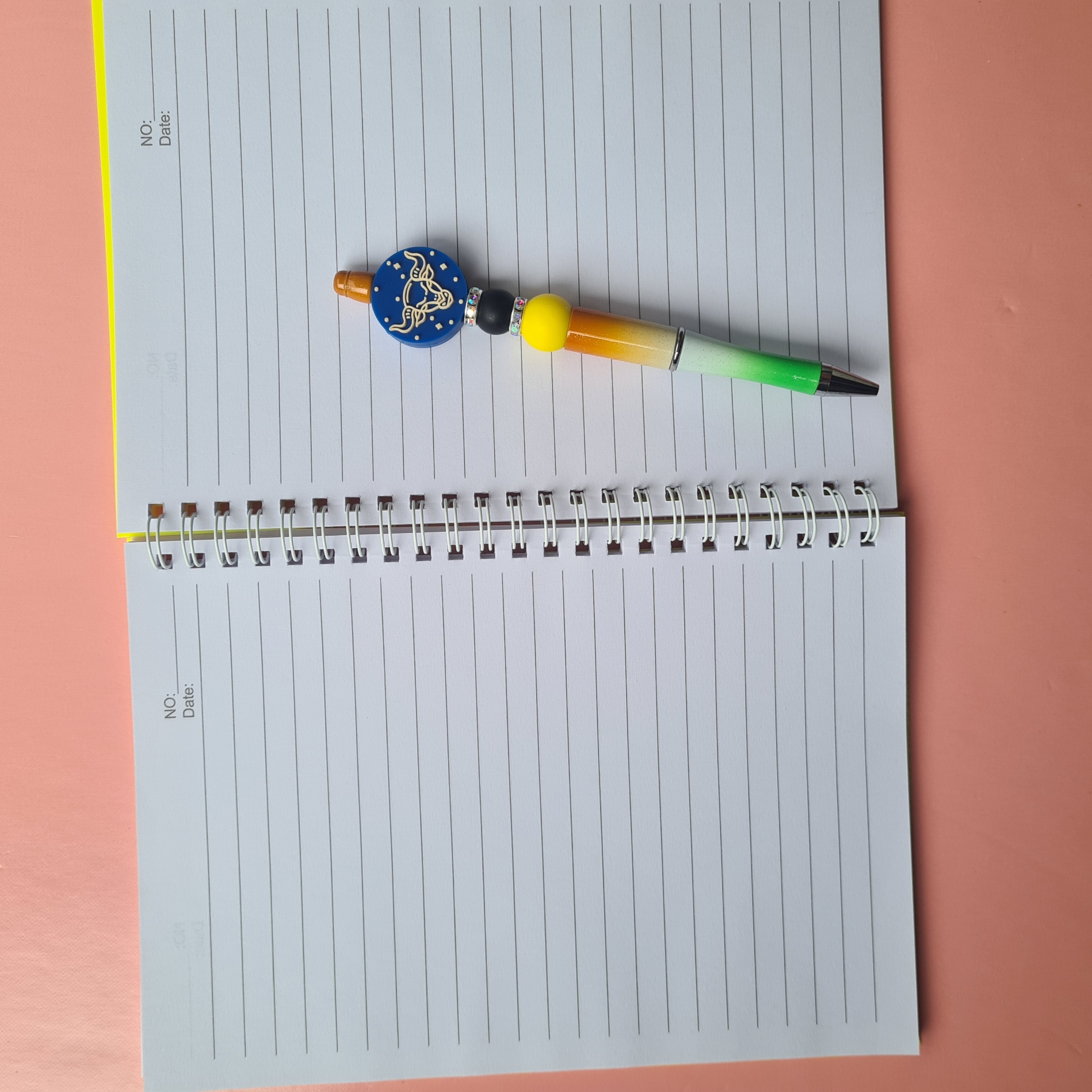 Paired with an orange, white, and green ombre pen finished with a Taurus symbol bead, this bundle reflects Taurus’ earthy and reliable nature.