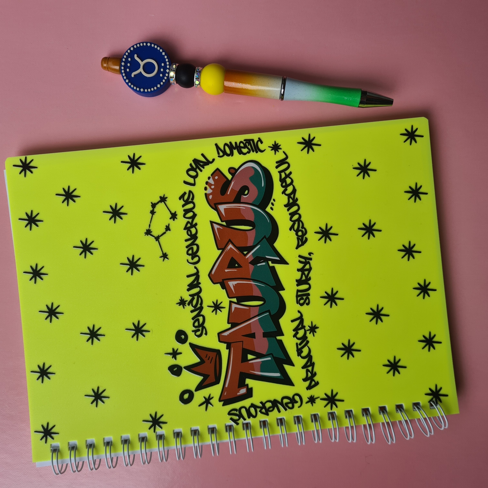 Notebook Design: A5 yellow notebook with Taurus surrounded by grounding personality traits