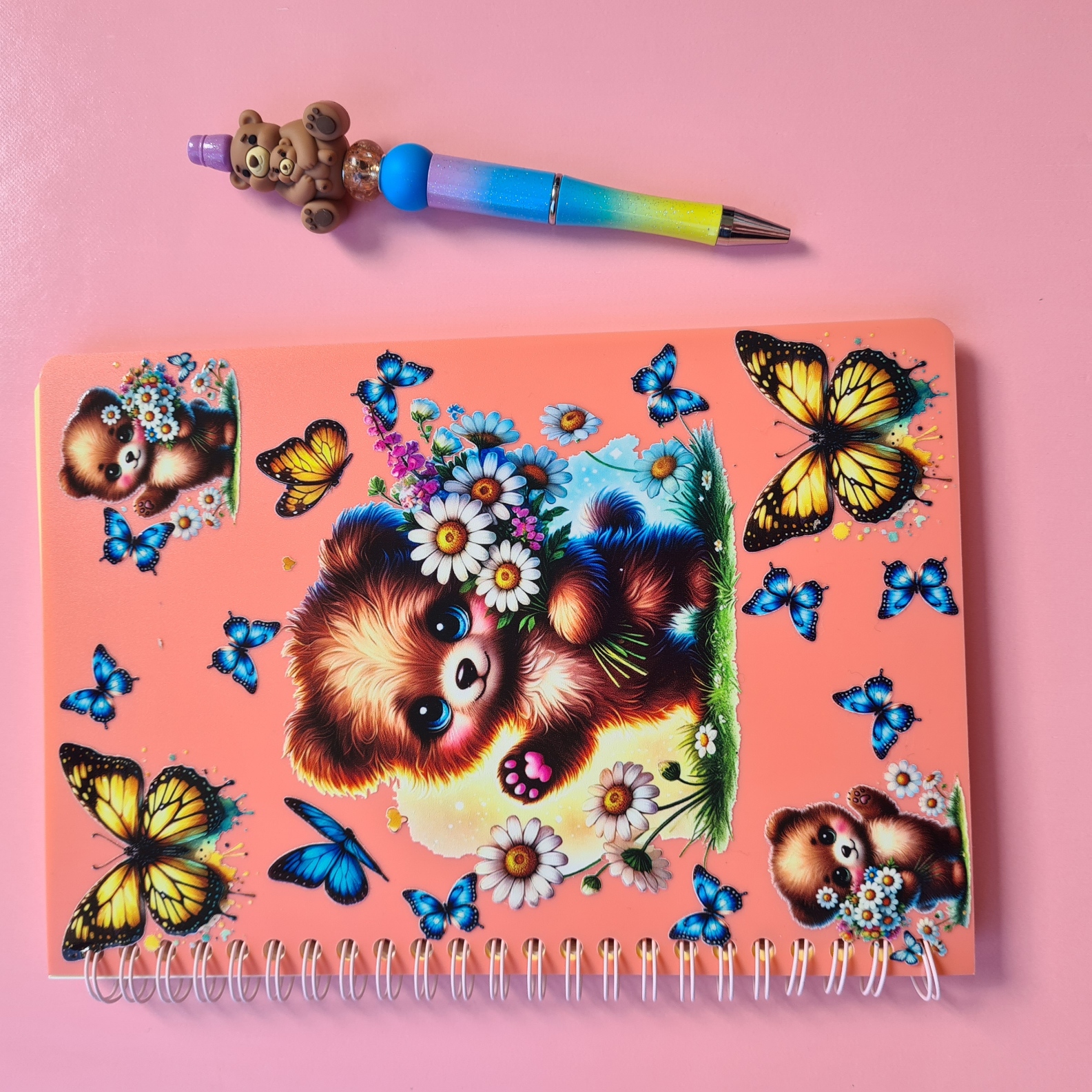 Notebook Design: Peach-orange A5 notebook featuring teddy bears with bouquets and blue and yellow butterflies