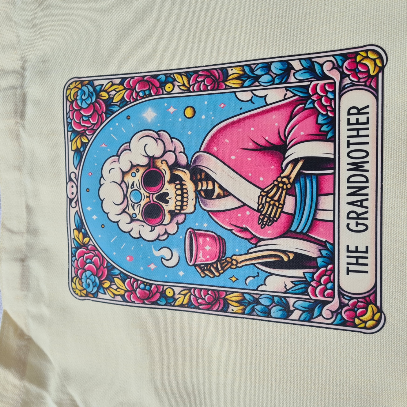 • Tarot-style skeleton artwork titled The Grandmother