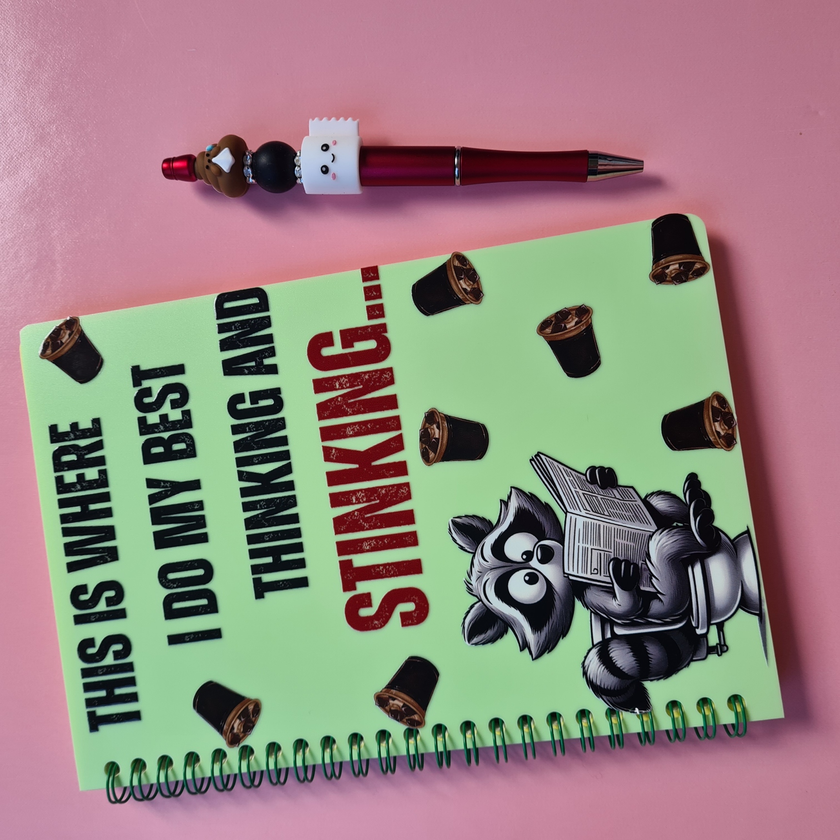 Notebook Design: Green notebook with a raccoon on the toilet and the phrase “this is where I do my best thinking and stinking...”