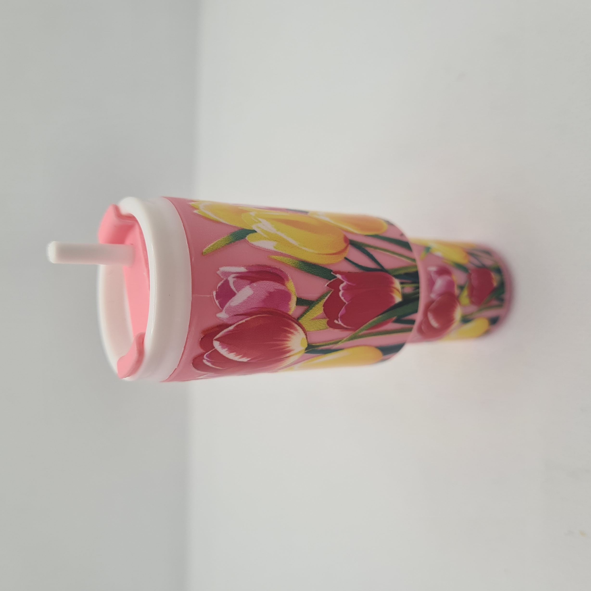 Add a fresh floral touch to your keys or bag with the Tulip Mini Tumbler Keychain. This light pink tumbler-shaped keychain is covered in vibrant red and yellow tulips, creating a bright and cheerful design.