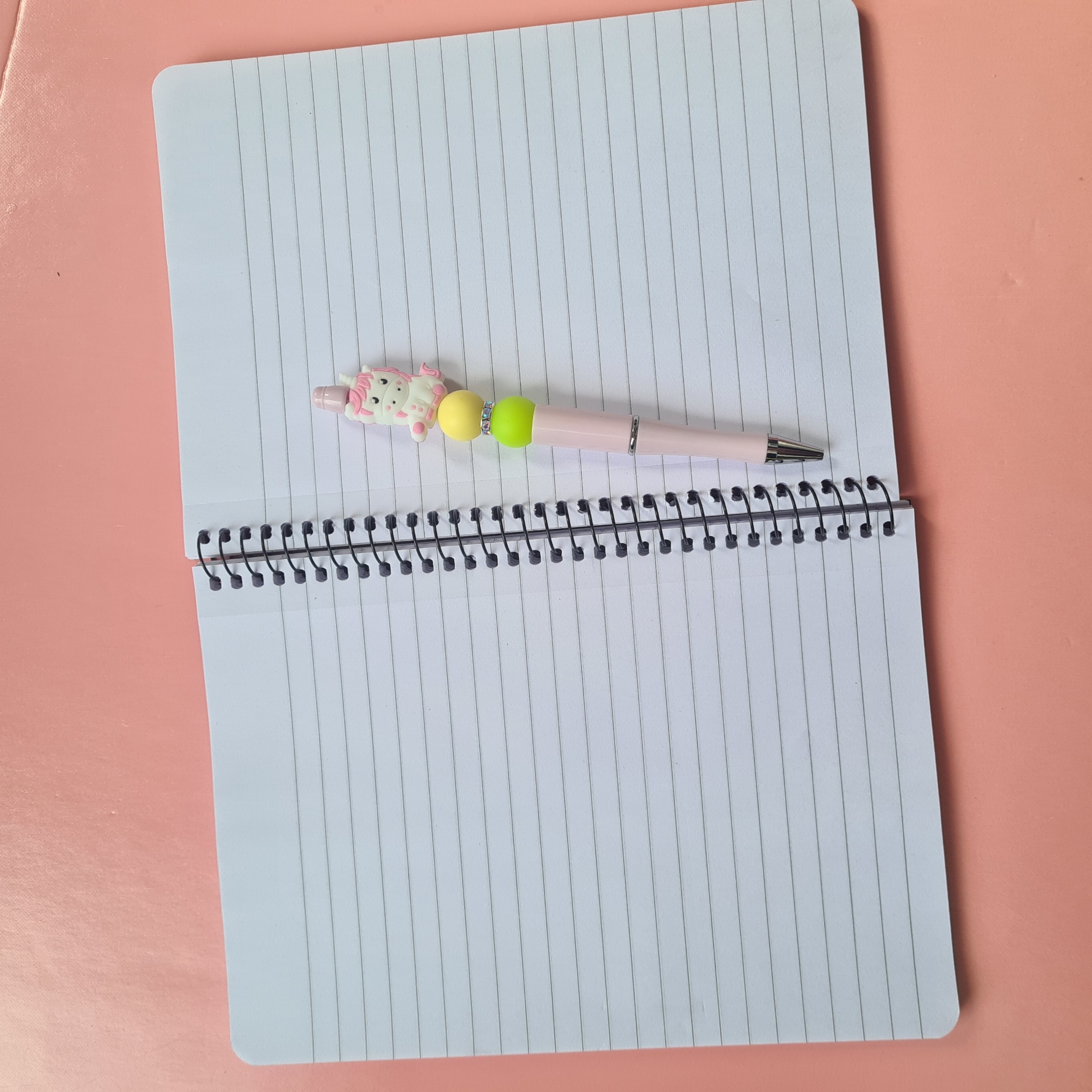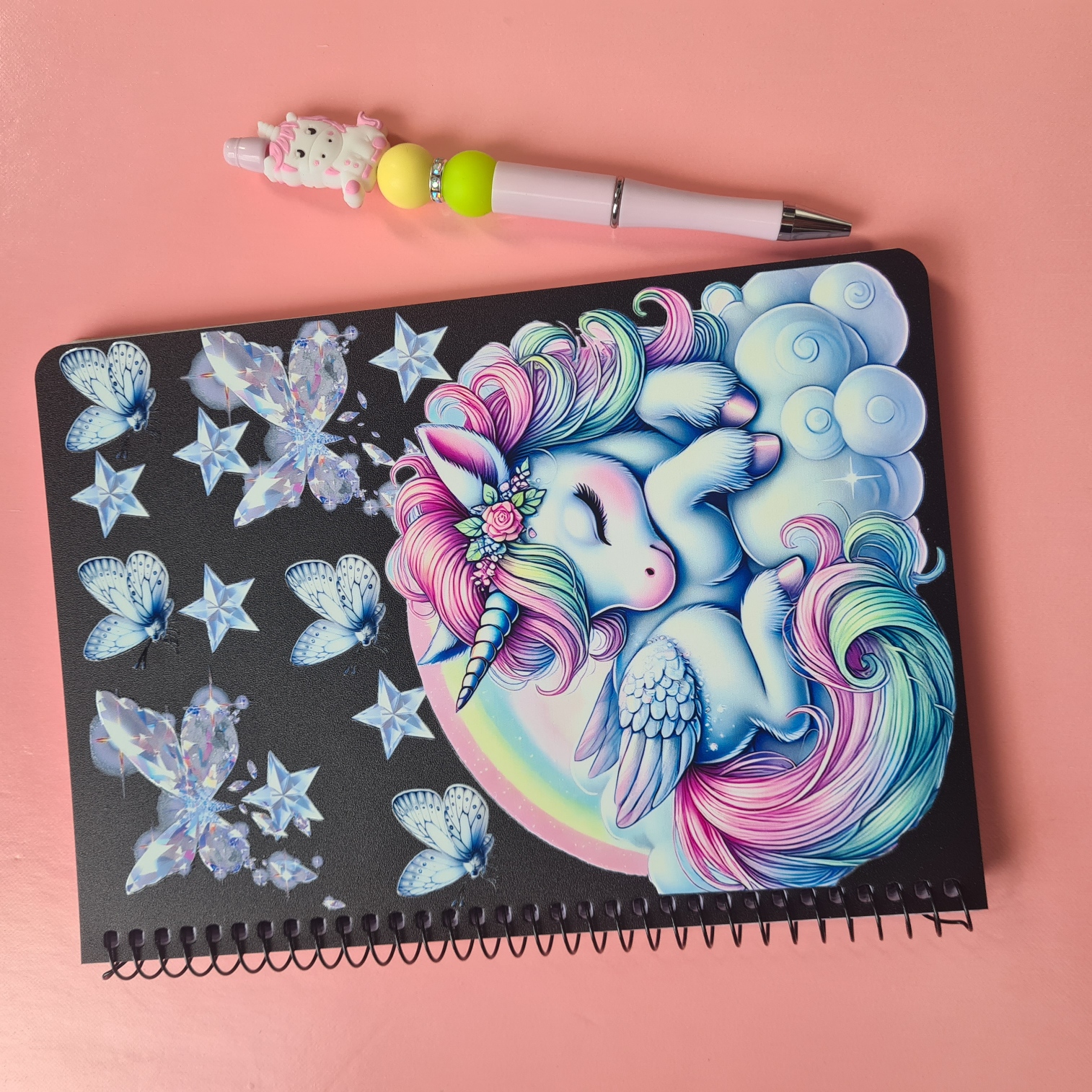 The bundle comes with a coordinating pink pen, complete with a unicorn bead and yellow and green accent beads, adding a playful touch to your writing experience.