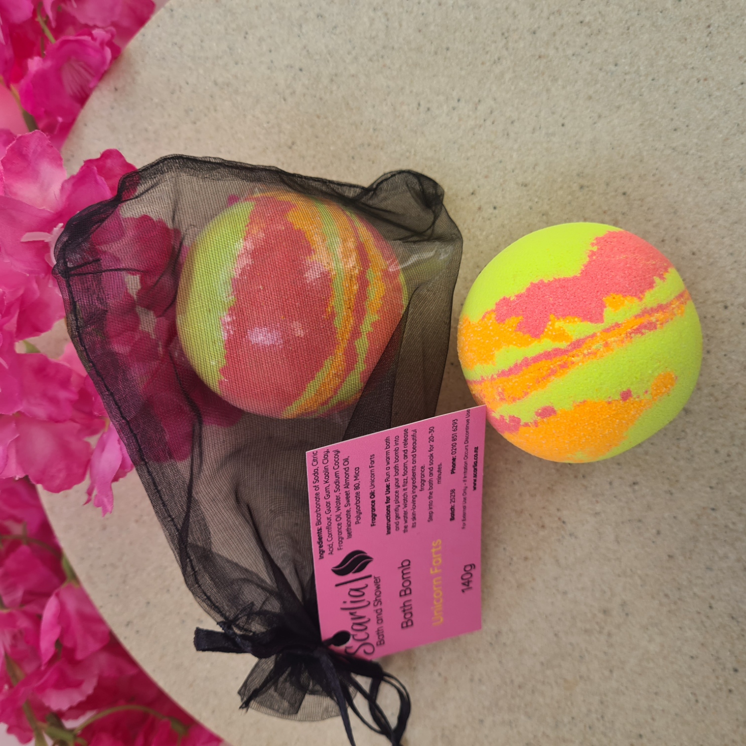 Let the magic fizz! Our Unicorn Farts Bath Bomb is a whimsical treat bursting with colour, sparkle, and a cheeky fragrance that’s as playful as its name. Scented with the fun and fruity aroma of Unicorn Farts (think sweet, candy-like vibes), this bath bomb brings joy to bath time with its vibrant colours and biodegradable glitter.