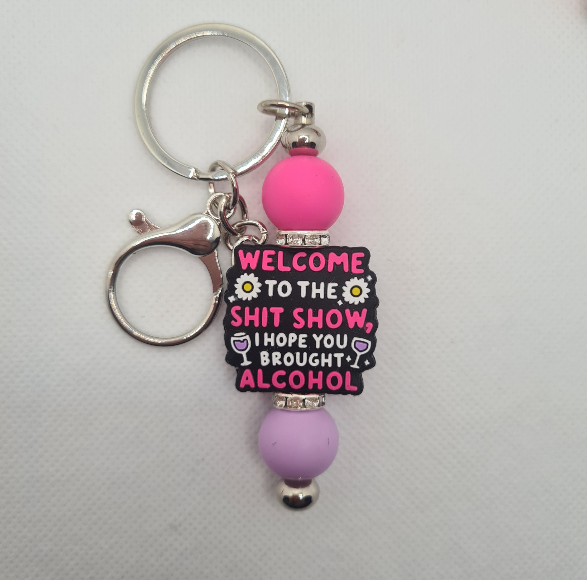 Bold, hilarious, and brutally honest, our Welcome to the Shit Show Silicone Bead Keychain is perfect for anyone who handles chaos with humour. The statement focal bead reads “Welcome to the shit show, I hope you bought alcohol” — making it an instant conversation starter. It’s paired with vibrant pink and purple silicone beads for a fun pop of colour that matches the cheeky vibe.