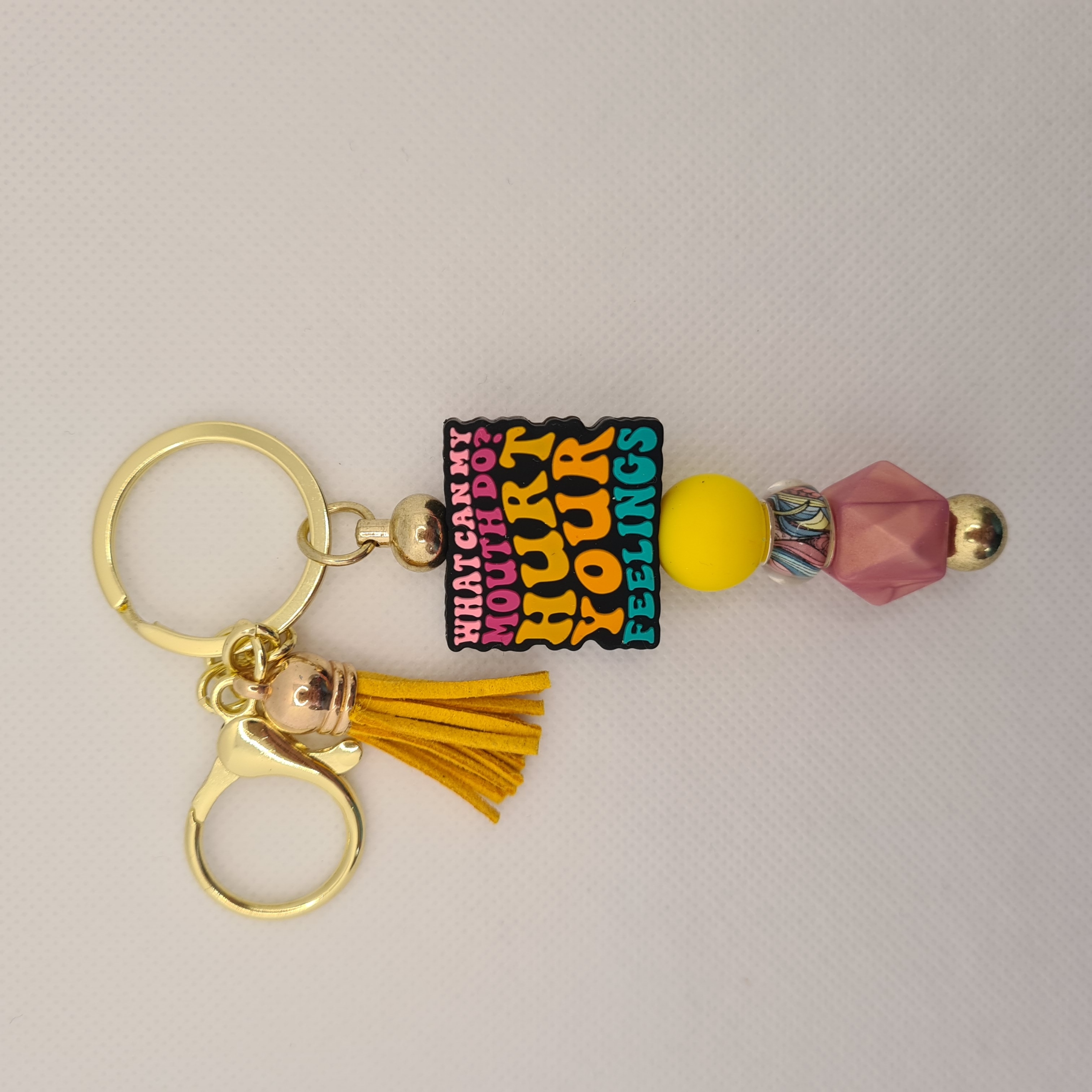 Bold, cheeky, and full of attitude, our What Can My Mouth Do? Silicone Bead Keychain is made for those who speak their mind. The standout focal bead features the playful phrase “What Can My Mouth Do? Hurt Your Feelings” — a sassy reminder of your unapologetic confidence. It’s paired with bright yellow and pink silicone beads for a fun pop of colour.