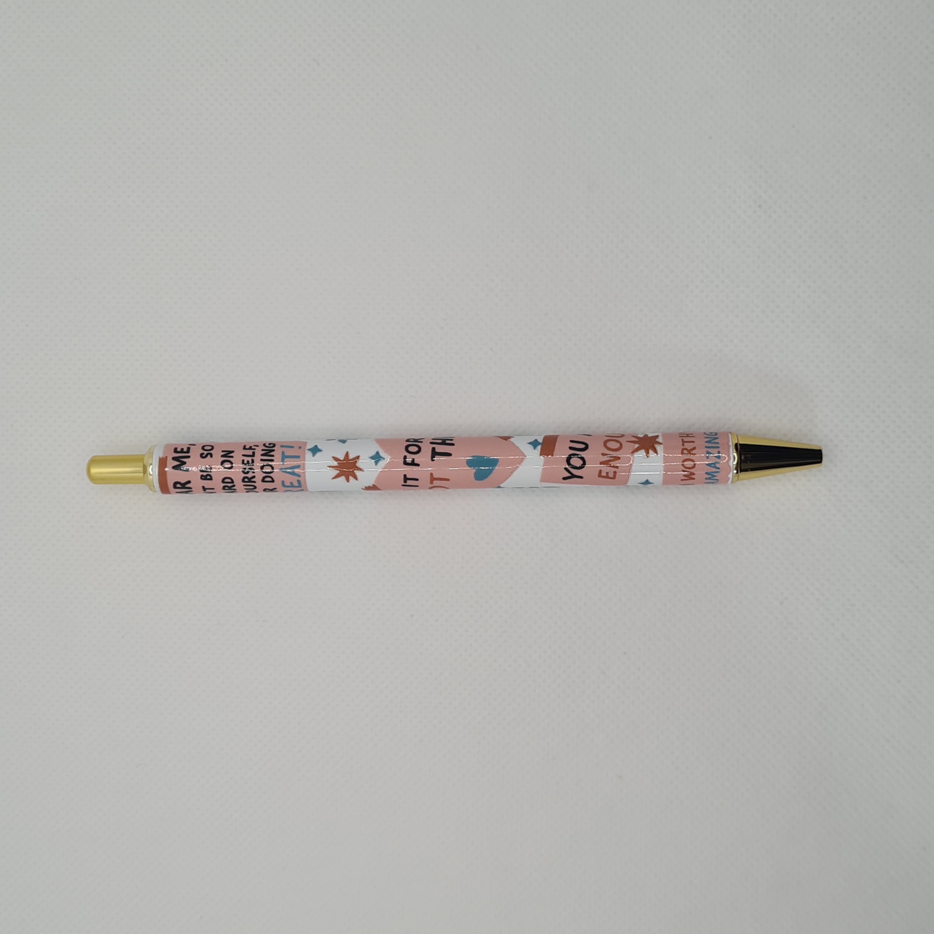Design: White pen featuring affirmations — “Dear me, don't be so hard on yourself, you're doing great!”, “Do it for you, not them”, “You are enough”, “I am worthy of an amazing life”